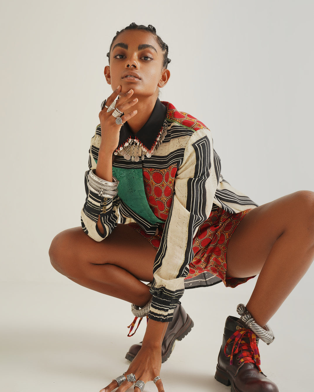 Printed straight shirt with a solid-colored embroidered collar, accented with M.O.P. bead details. Effortless and easy fit.