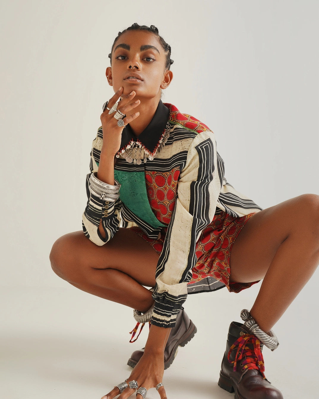 Printed straight shirt with a solid-colored embroidered collar, adorned with M.O.P. bead details, paired with effortless printed shorts with an elasticated waist for a relaxed fit.