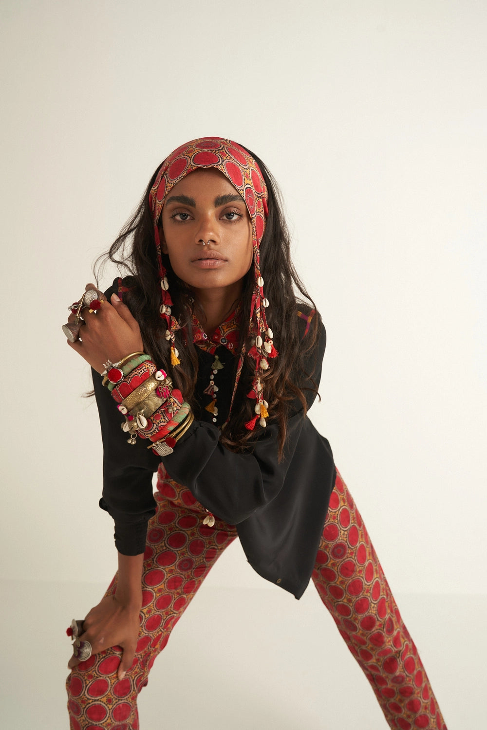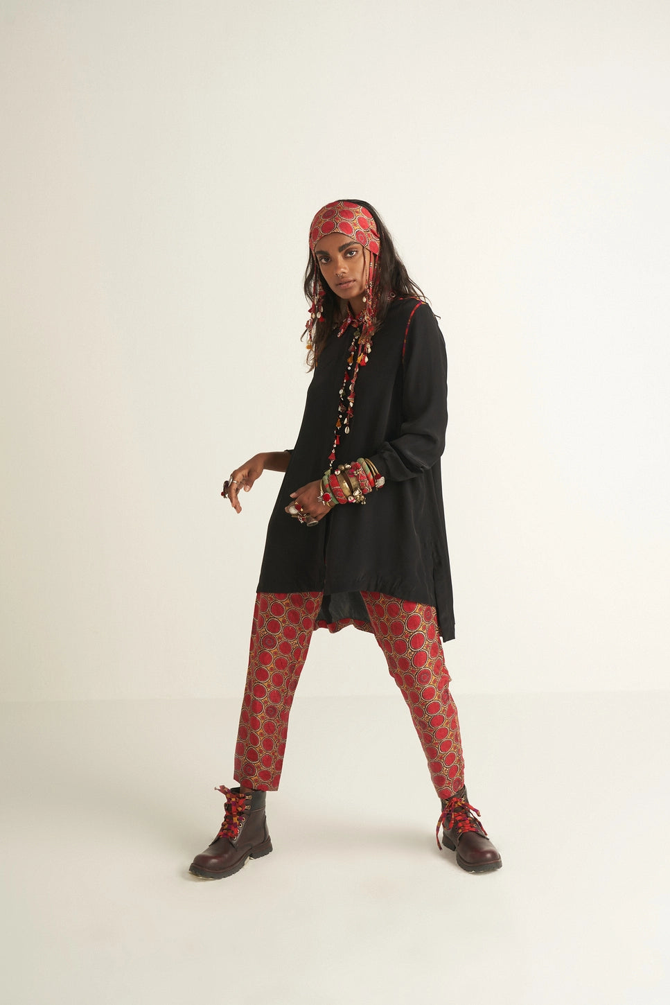 Solid-colored straight shirt with printed inserts, an embroidered collar, and delicate M.O.P. bead and tassel accents, paired with sleek printed trousers. Effortless fit with an elasticated waist for all-day comfort.