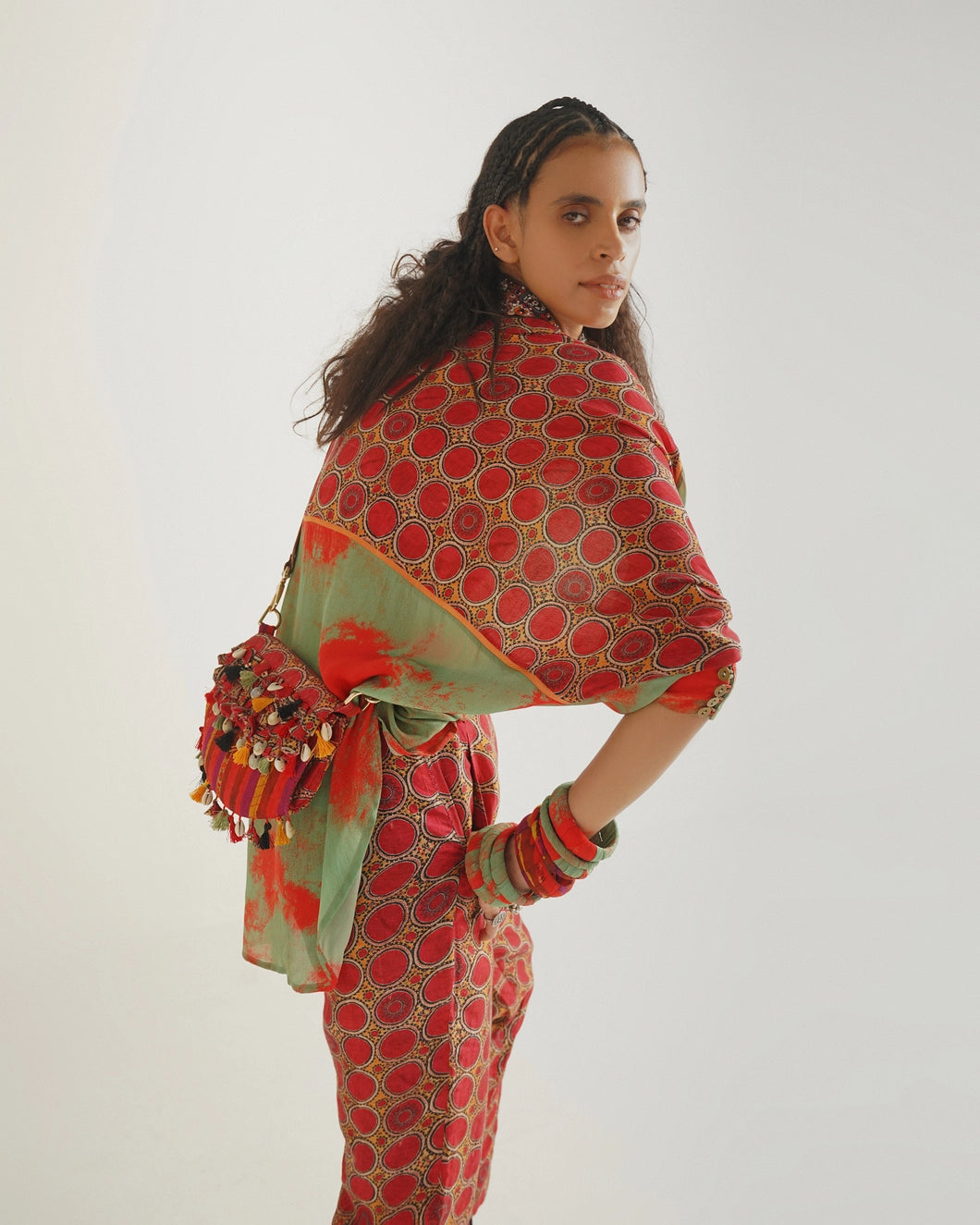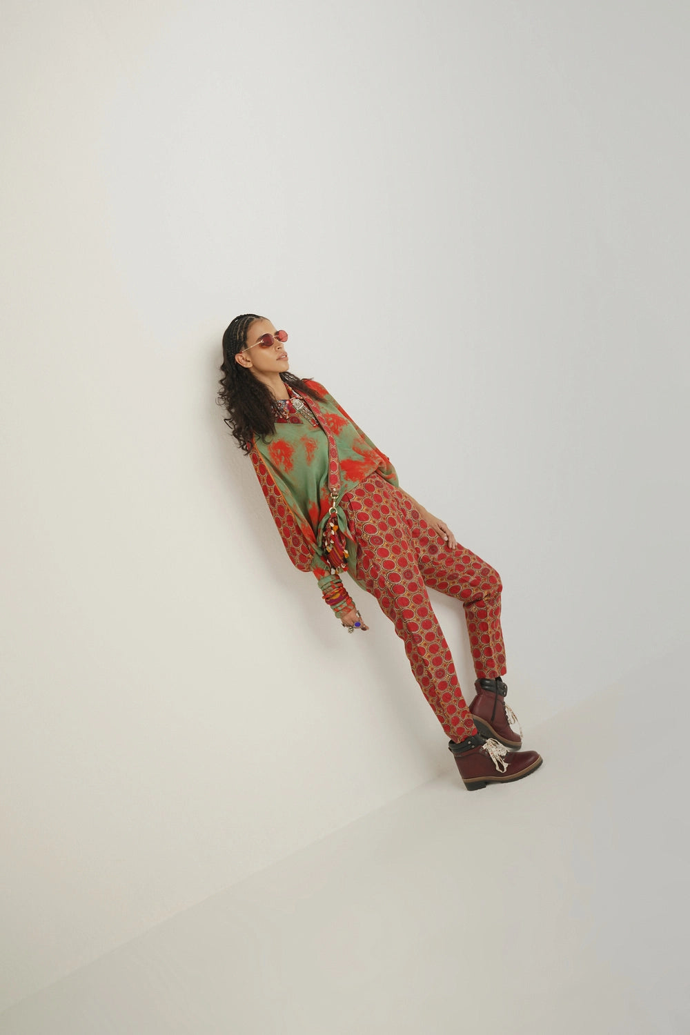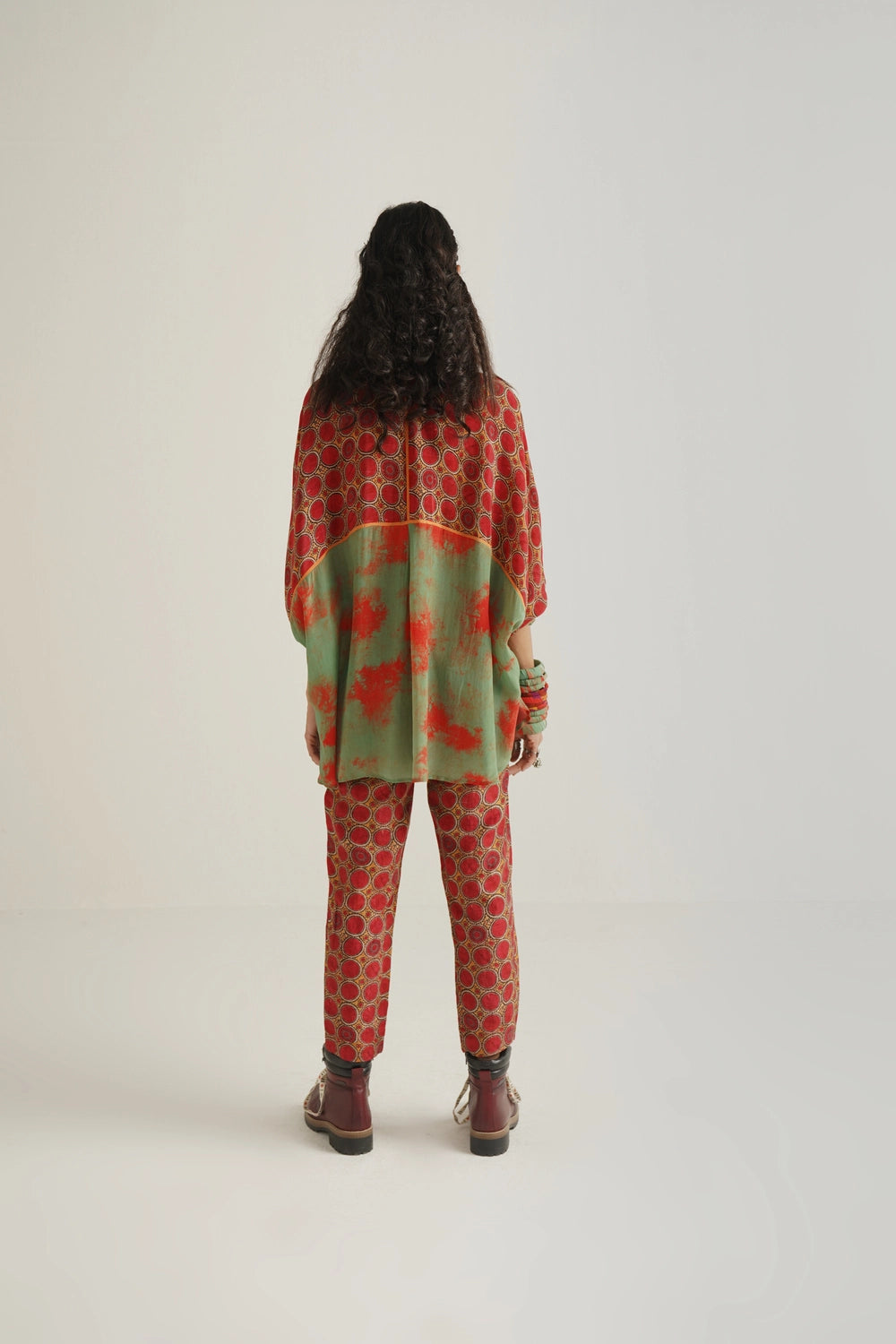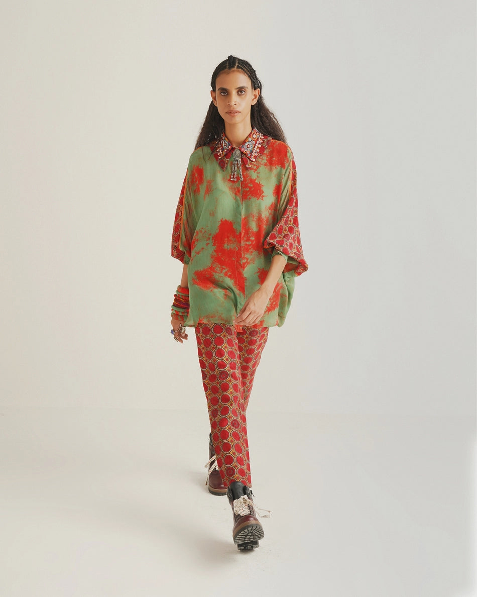 Tie-dye trapeze dual print shirt with inserts and an embroidered collar, paired with printed slim-fit trousers. Resham thread and mirror embroidery. No armholes. Easy fit for all sizes.