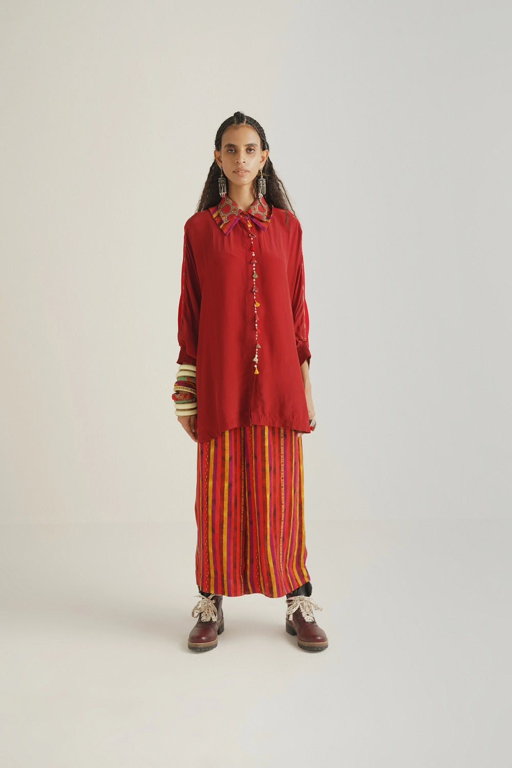 Solid-colored trapeze shirt with printed inserts and a double collar, adorned with M.O.P. beads and tassel details. No armholes for effortless drape.Easy fit for all sizes.