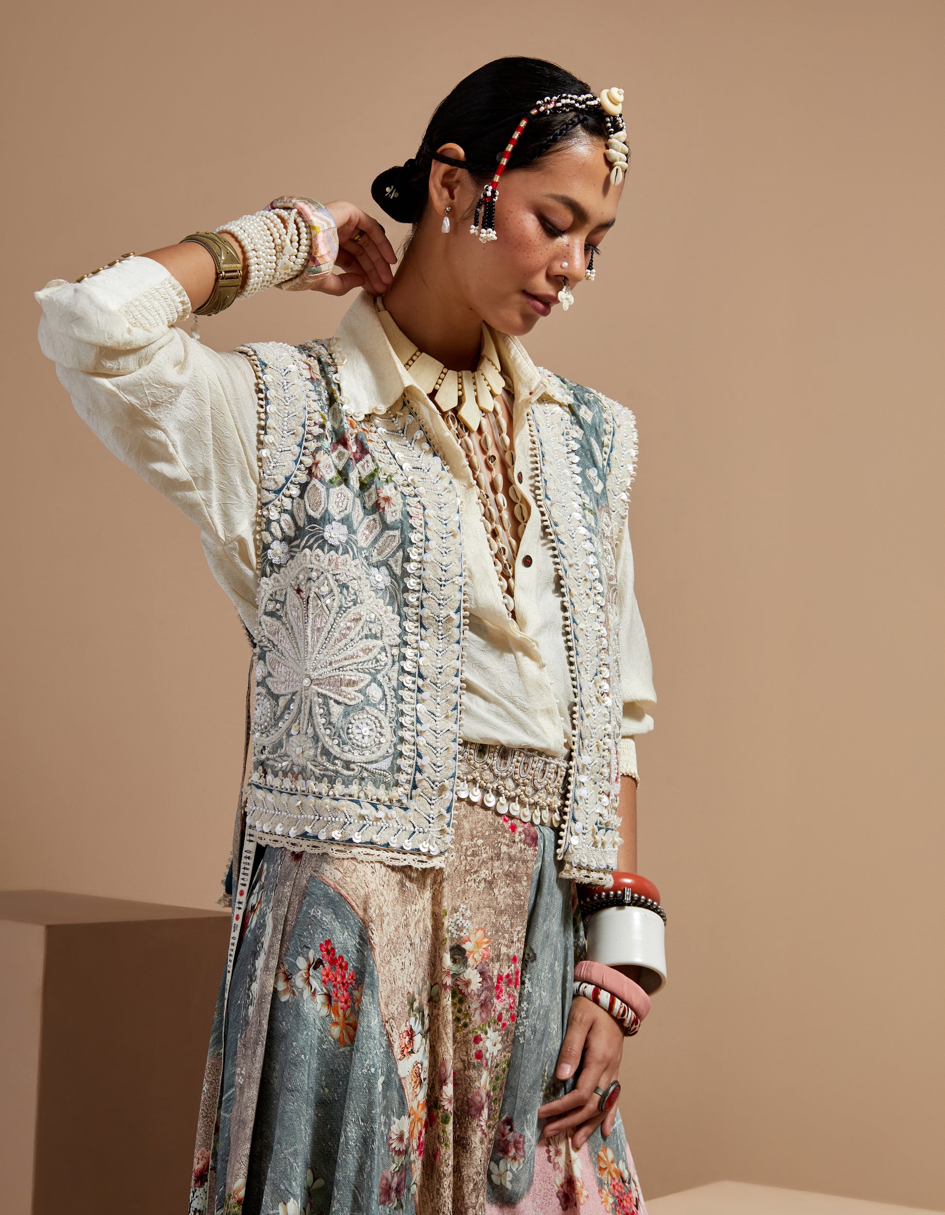 Embroidered gilet with tribal tassel details, featuring Resham thread embroidery, beadwork, and a highlighted tribal yoke with tassel accents. Free-size gilet with no armholes and side laces for a customizable fit