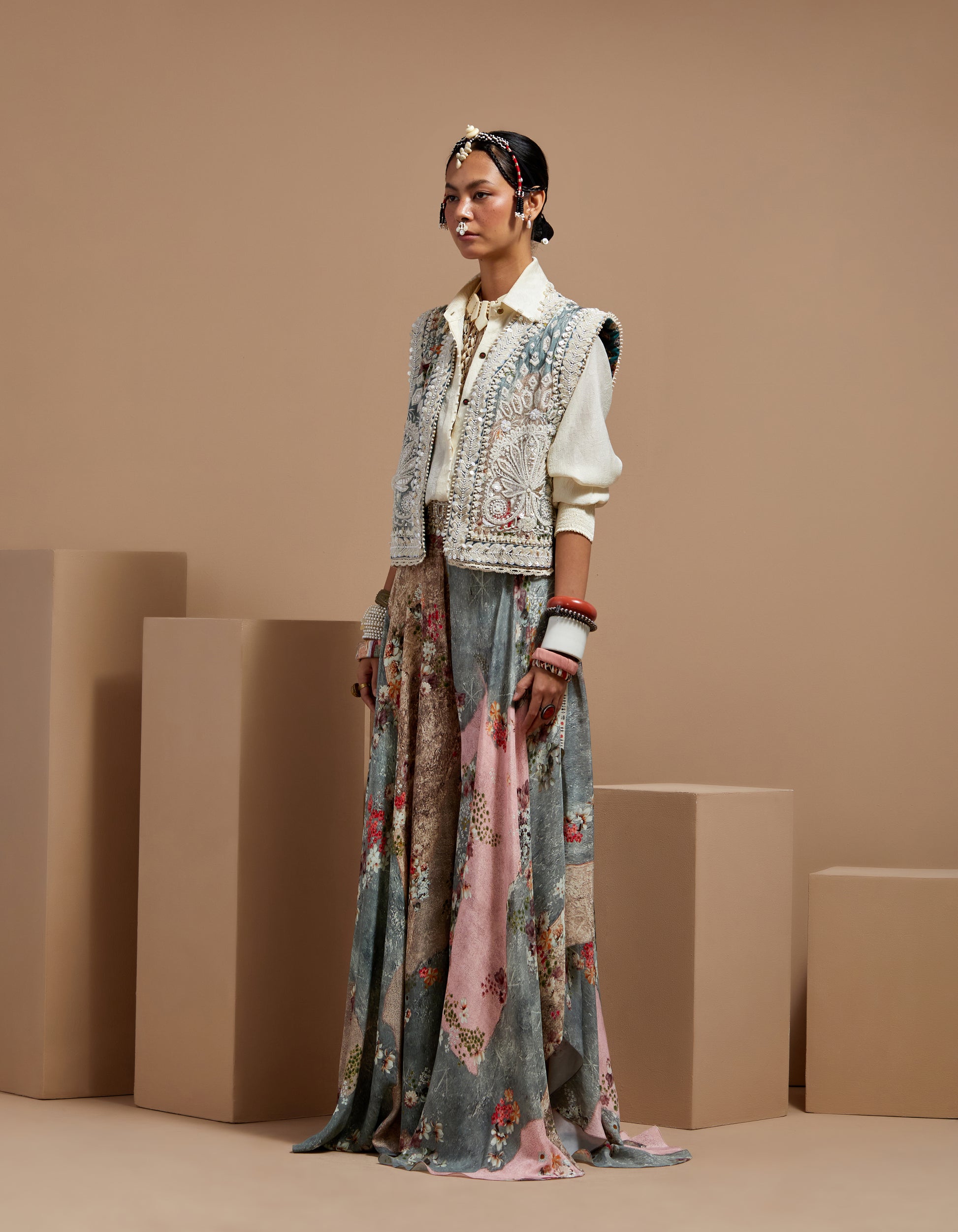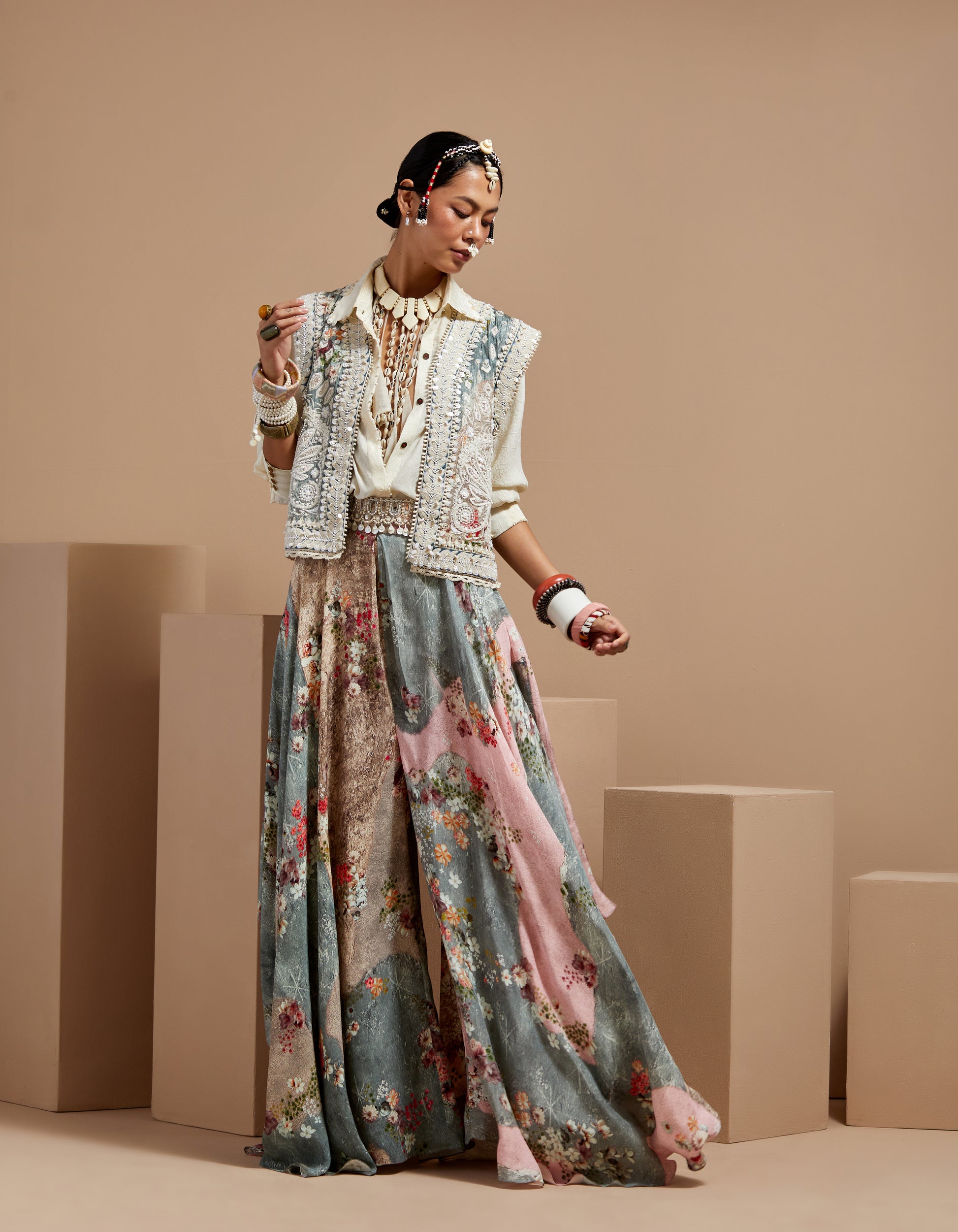 Embroidered gilet paired with yoke-embroidered blouse and chevron printed trousers. Features Resham thread embroidery, beadwork, highlighted tribal yoke, and tassel details. Body-fitted blouse with elasticated