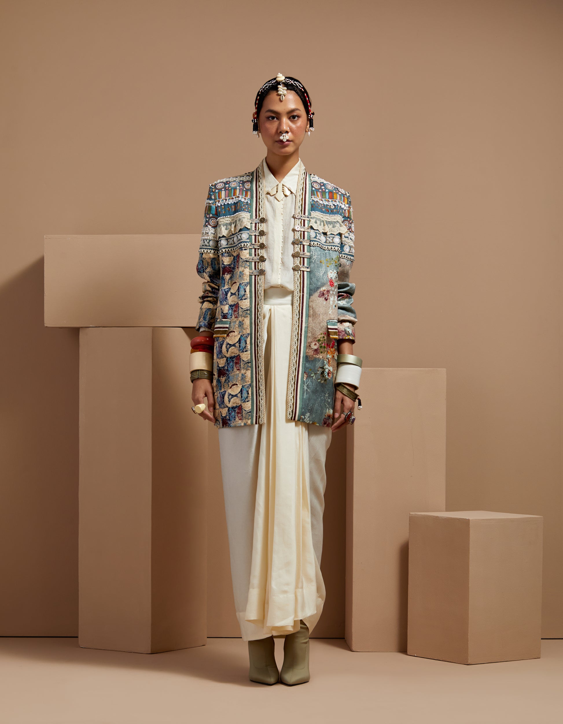 Heavily embroidered open jacket with tribal detailing and AK brand button, paired with a classic straight shirt and pleated skirt. Featuring resham thread embroidery, cowri shells, bead, and tassel accents. Structured jacket with a relaxed-fit shirt and elasticated pleated skirt.