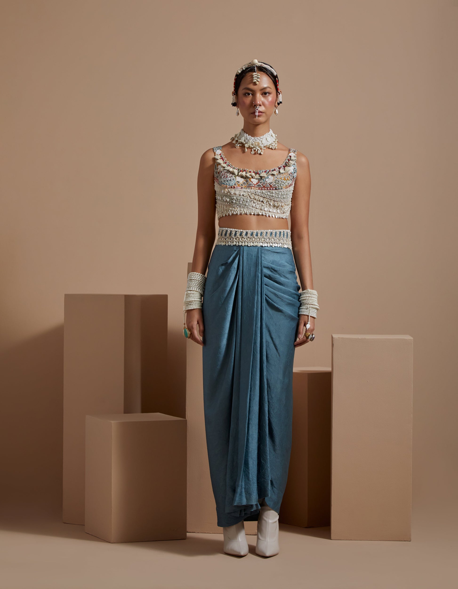 Fully embroidered beadwork blouse paired with a solid-colored pleated skirt and an embroidered veni dupatta jacket. Featuring lace accents and tribal tassel details. Body-fitted blouse, relaxed fit skirt with elasticated waist, and free-size jacket.