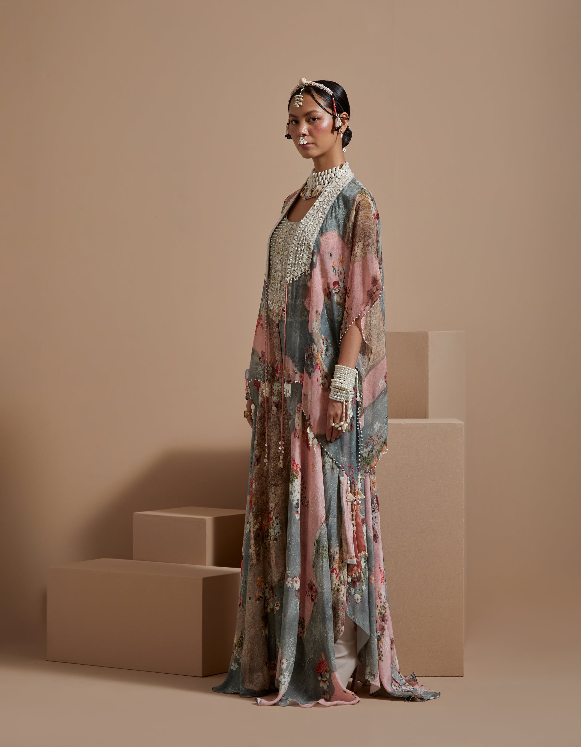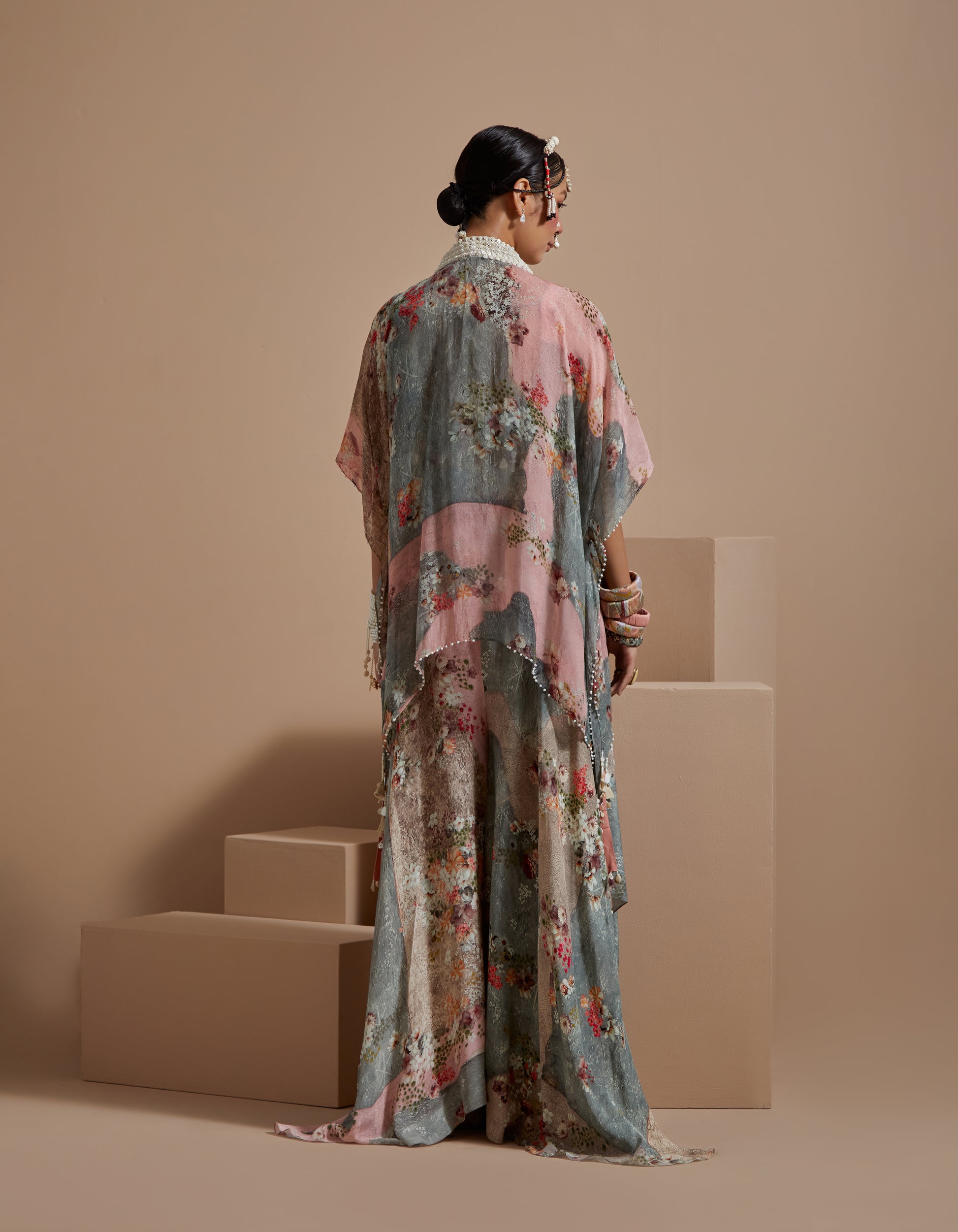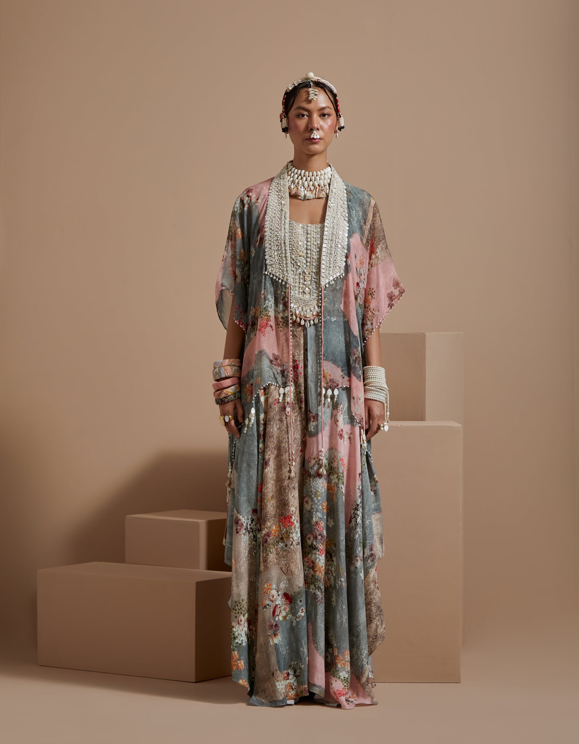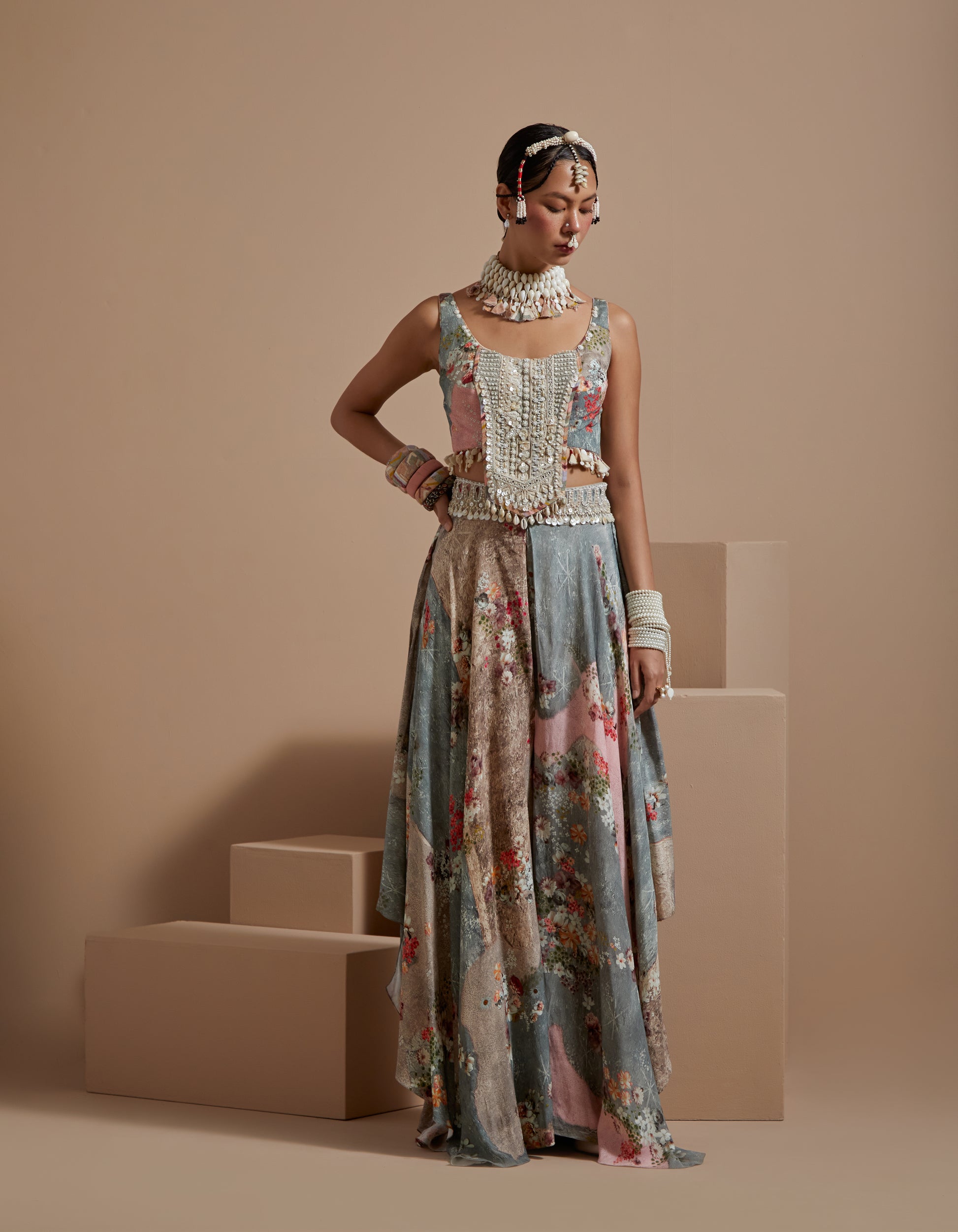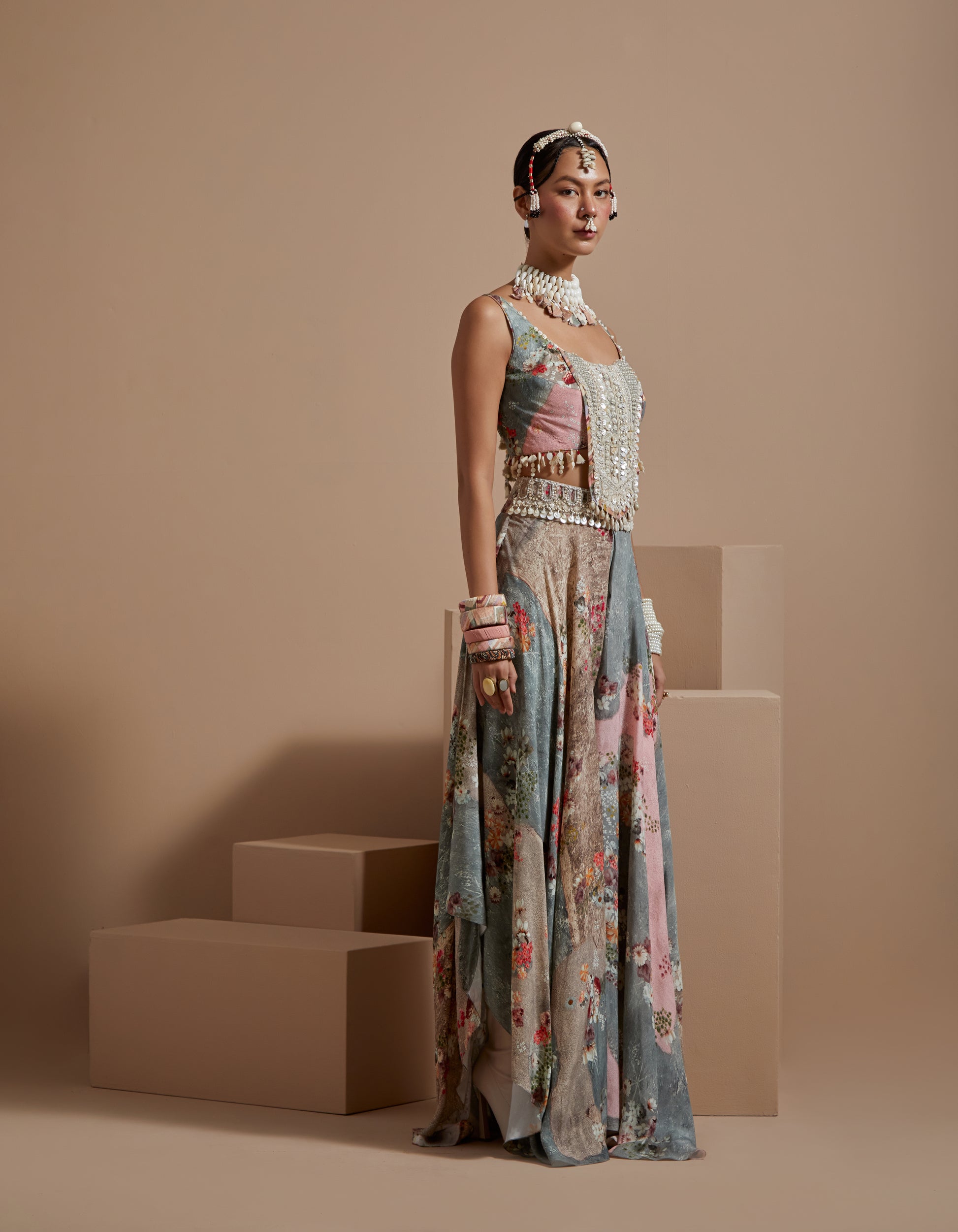 Printed and embroidered blouse paired with printed flared skirt and embroidered veni dupatta jacket. Features Resham thread embroidery, M.O.P. beads, and tassel details. Body-fitted blouse with relaxed fit elasticated waist skirt and anti-fit jacket.