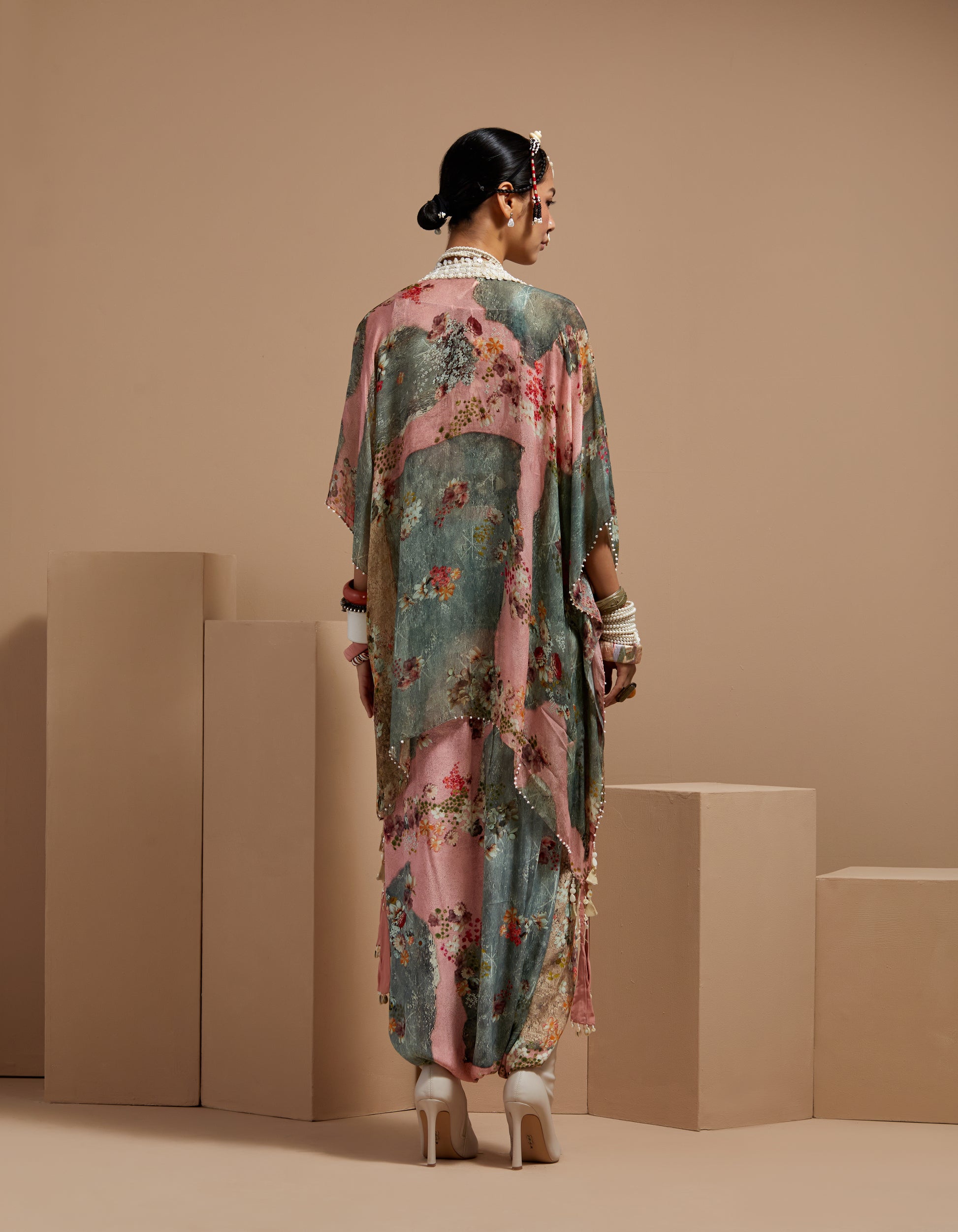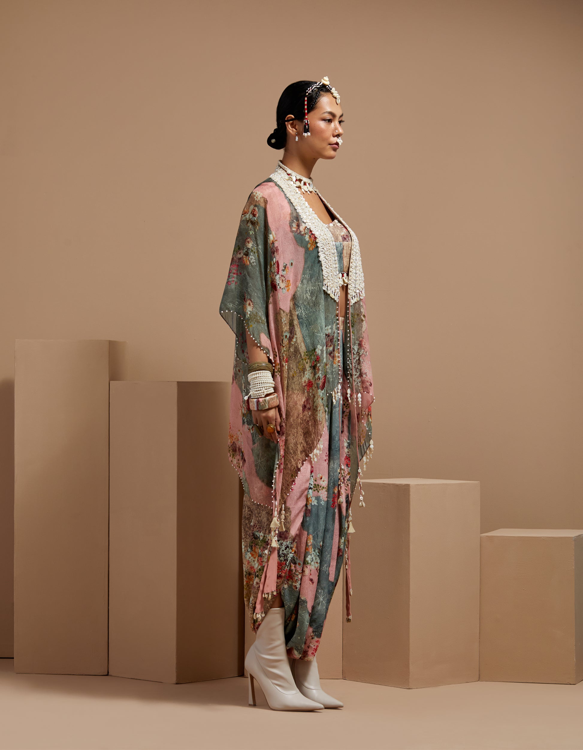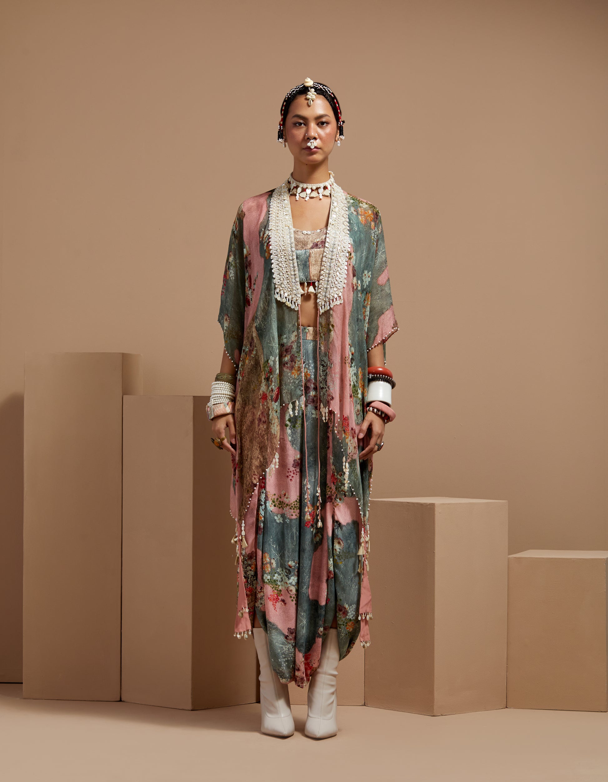 Geometrical blouse with printed draped trouser and embroidered printed veni dupatta jacket. Resham thread embroidery, M.O.P. bead, and tassel details. Body-fitted blouse with elasticated waist trouser and anti-fit jacket.