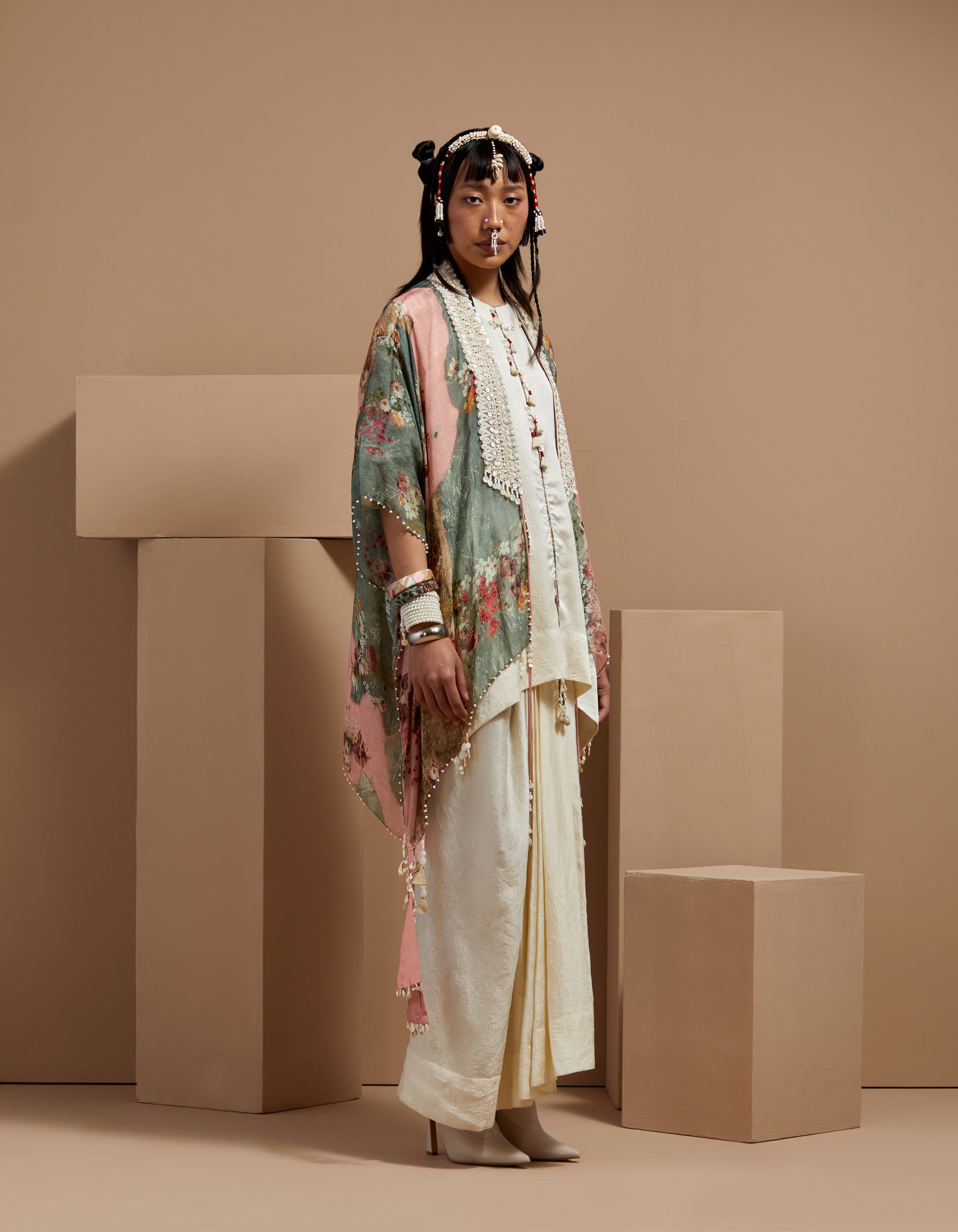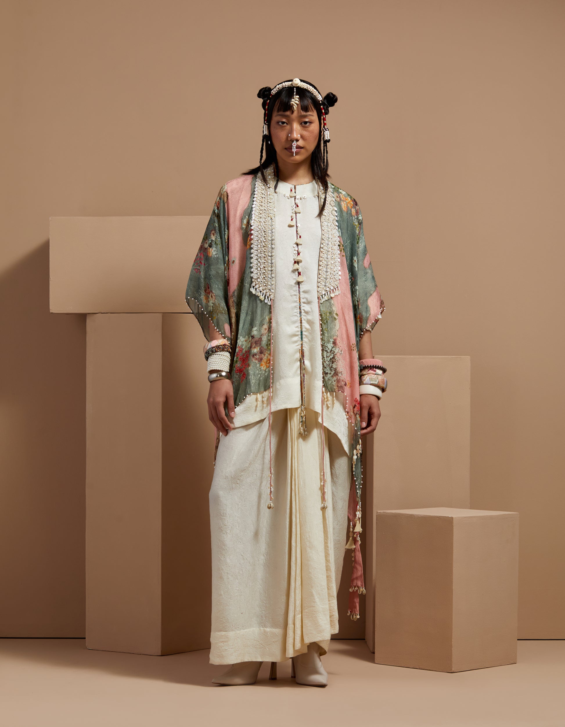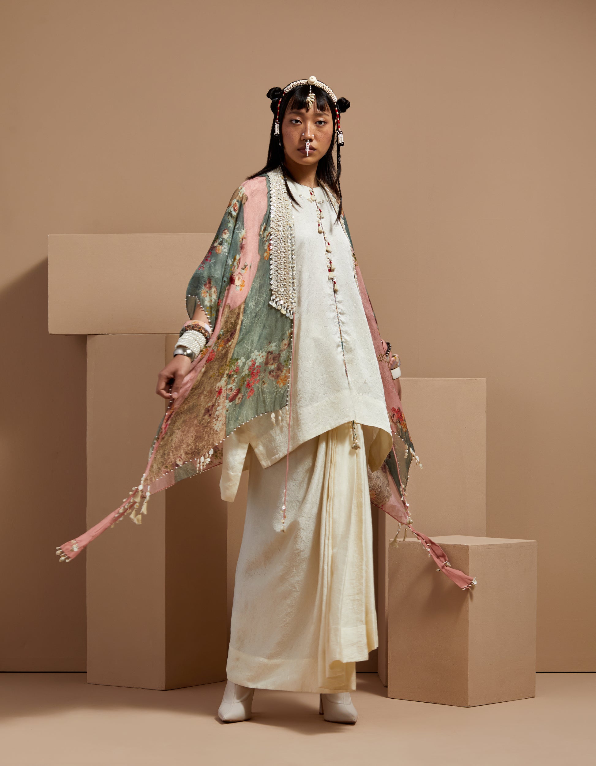 Textured solid short trapeze kurti with inserts, paired with a textured pleated skirt and embroidered printed veni dupatta jacket. Featuring lace work and tribal tassel details. Easy fit kurta with elasticated waist skirt and free-size anti-fit jacket.