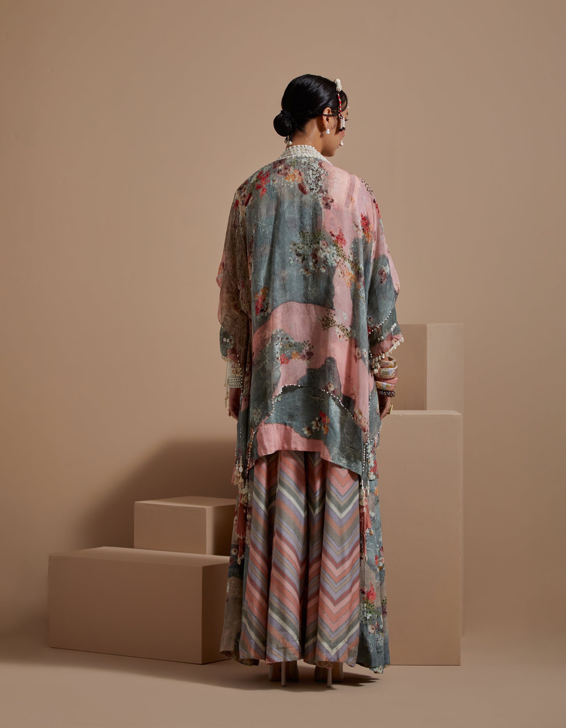 Printed kurta with embroidered hanging yoke paired with chevron-printed sharara trousers. Relaxed fit kurta with elasticated waist trousers. Layered with an embroidered and laced printed jacket featuring tribal tassel details.