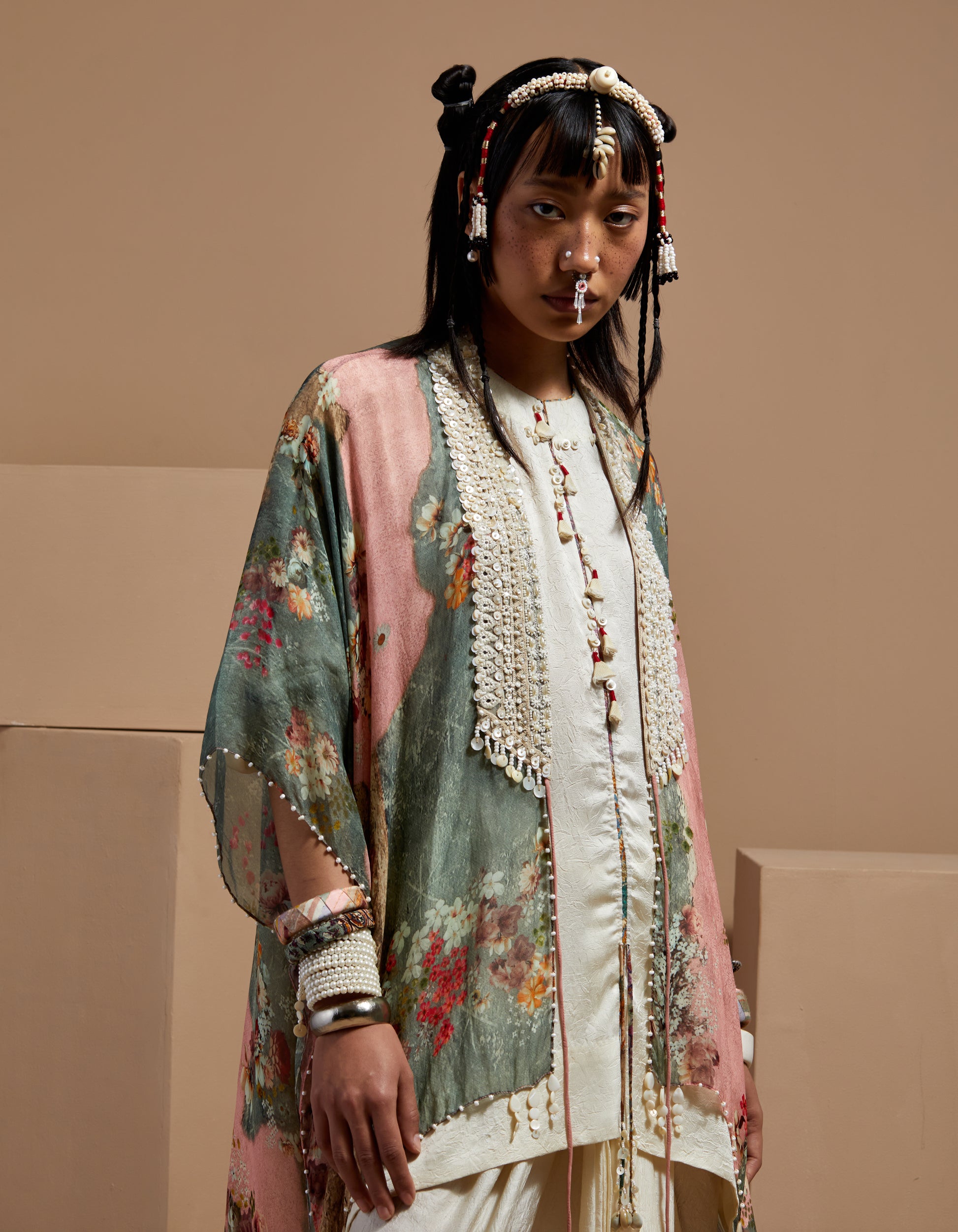 Embroidered and laced printed jacket with tribal tassel details, featuring Resham thread embroidery, bead accents, and highlighting. Free-size dupatta jacket without armholes.