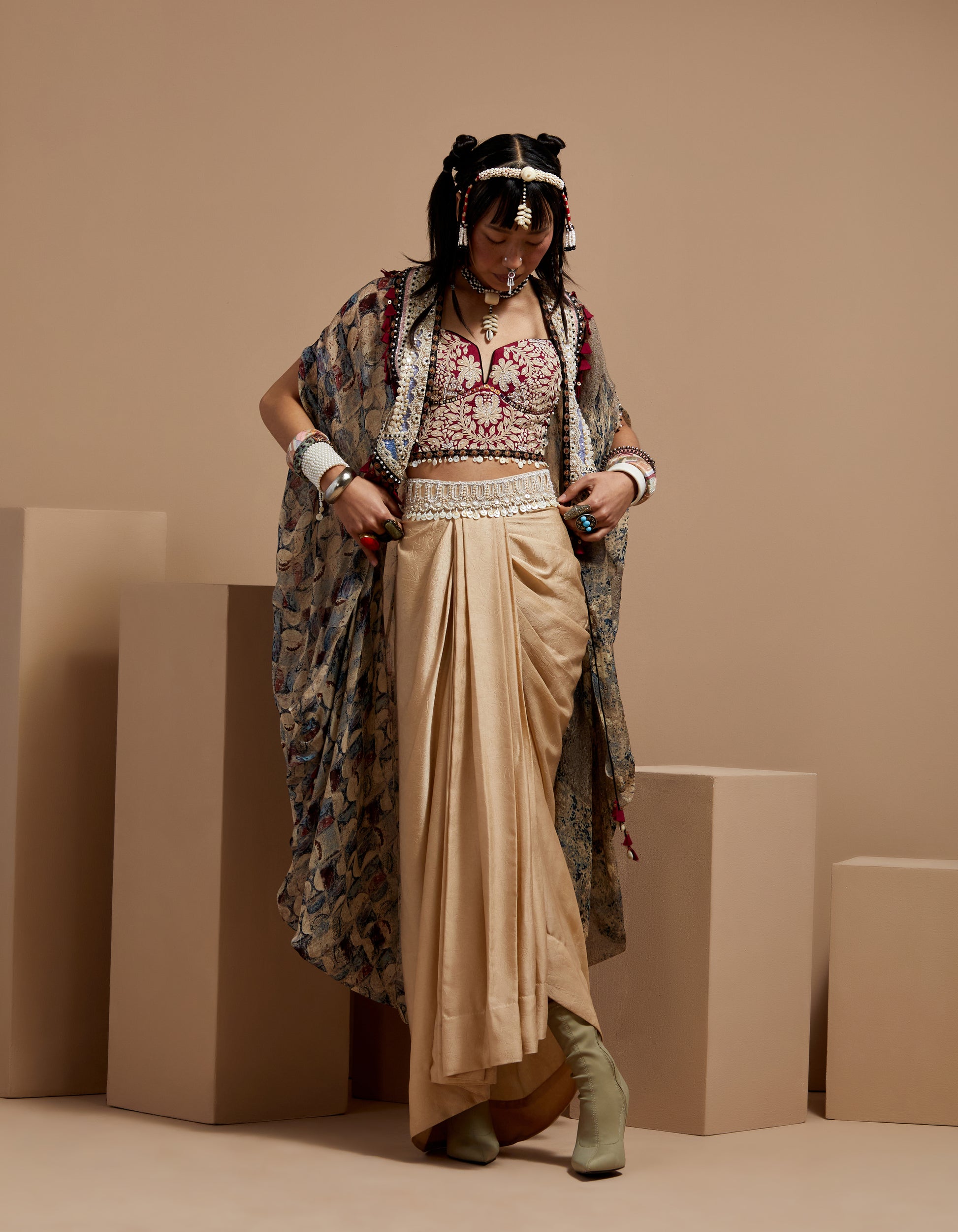 Embroidered and laced printed jacket with tribal tassel details. Full embroidered blouse with tassel detailing and tie-up at the back, paired with a textured pleated skirt featuring an embroidered waistband.