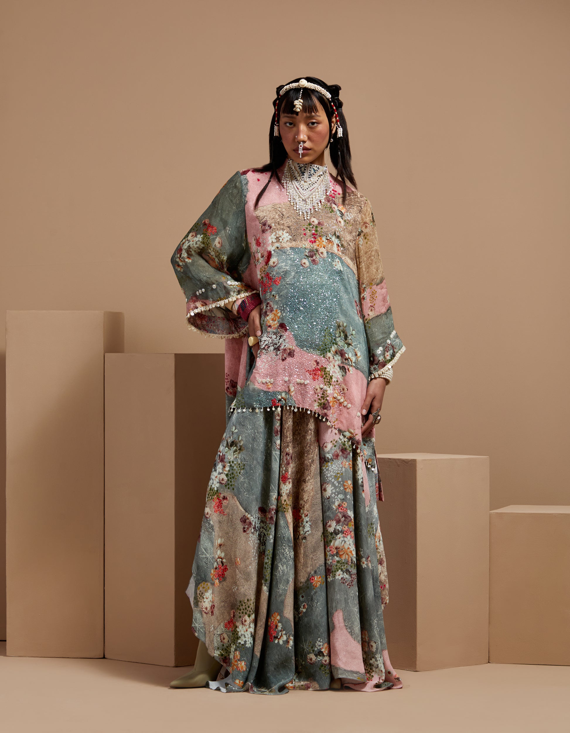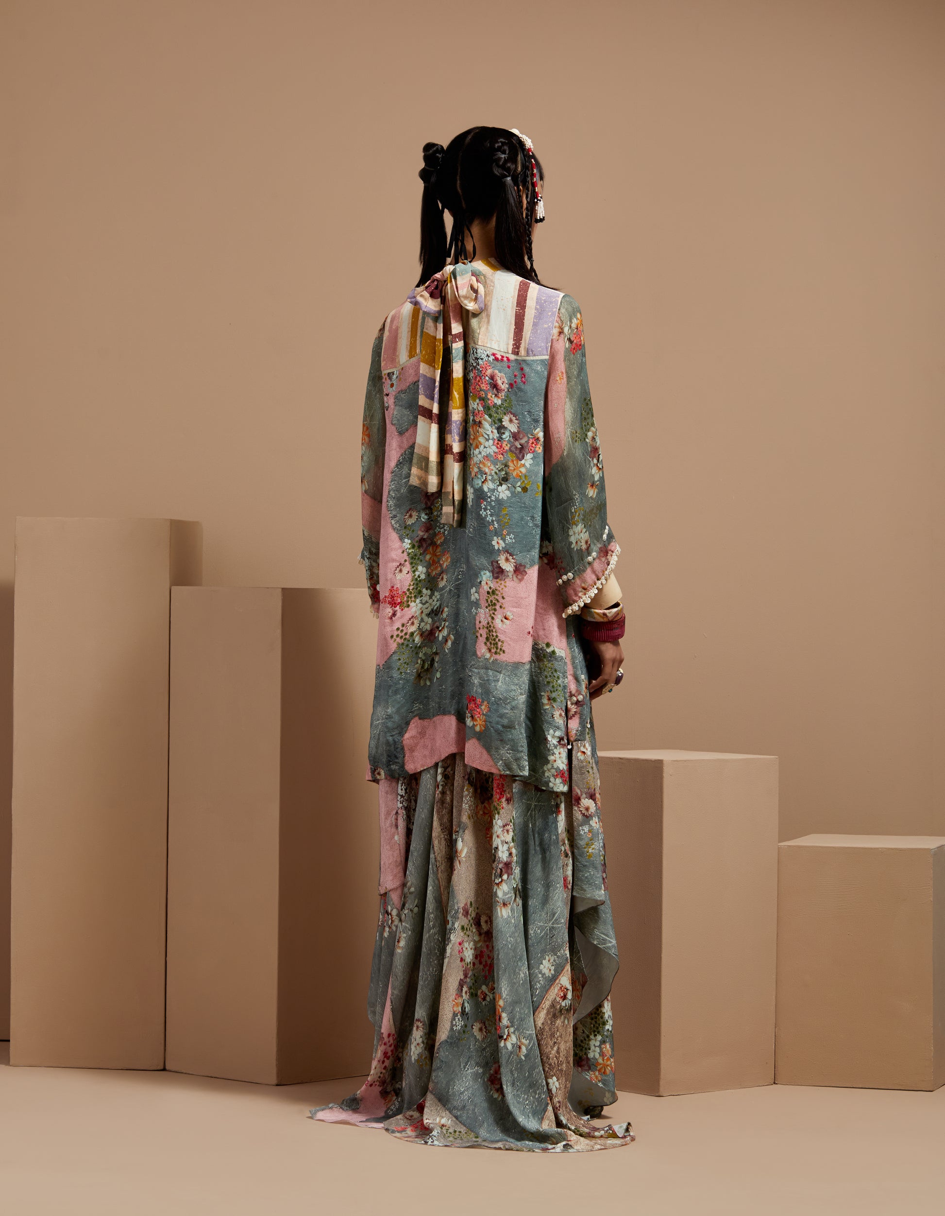 Printed kurta with embroidered hanging yoke paired with a printed flared skirt. Resham thread embroidery, lace, M.O.P. beads, and tassel details. Relaxed-fit kurta with elasticated waist skirt.