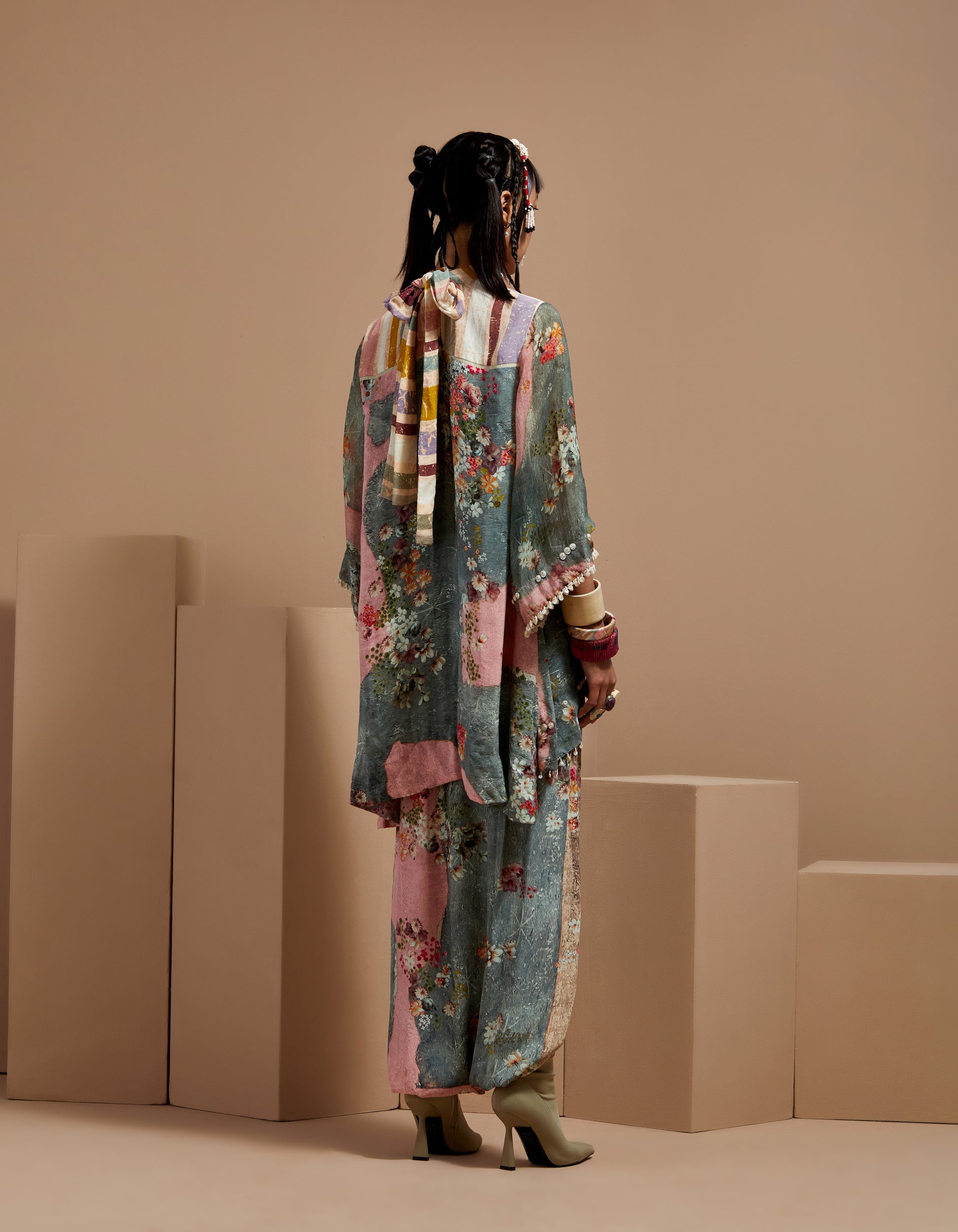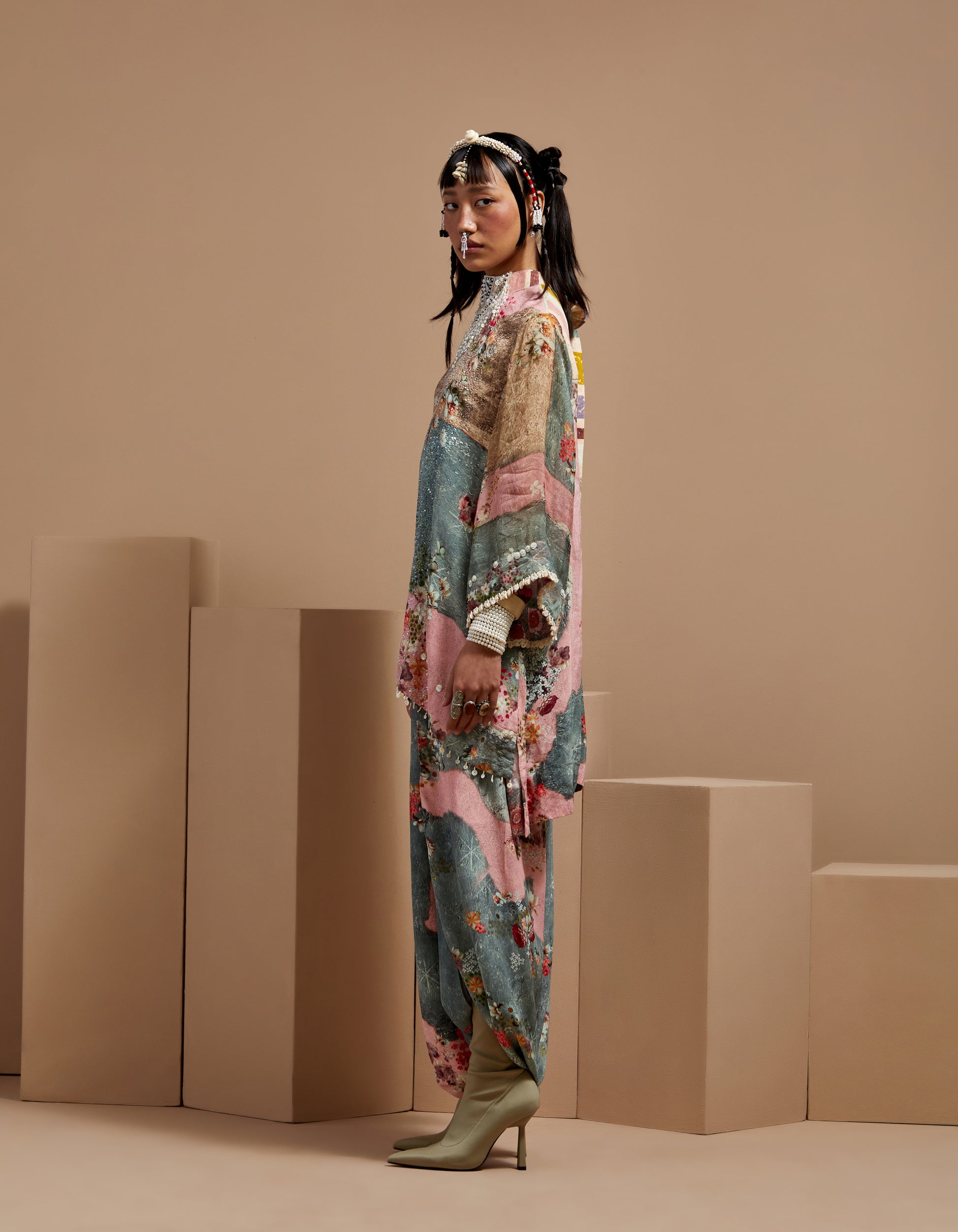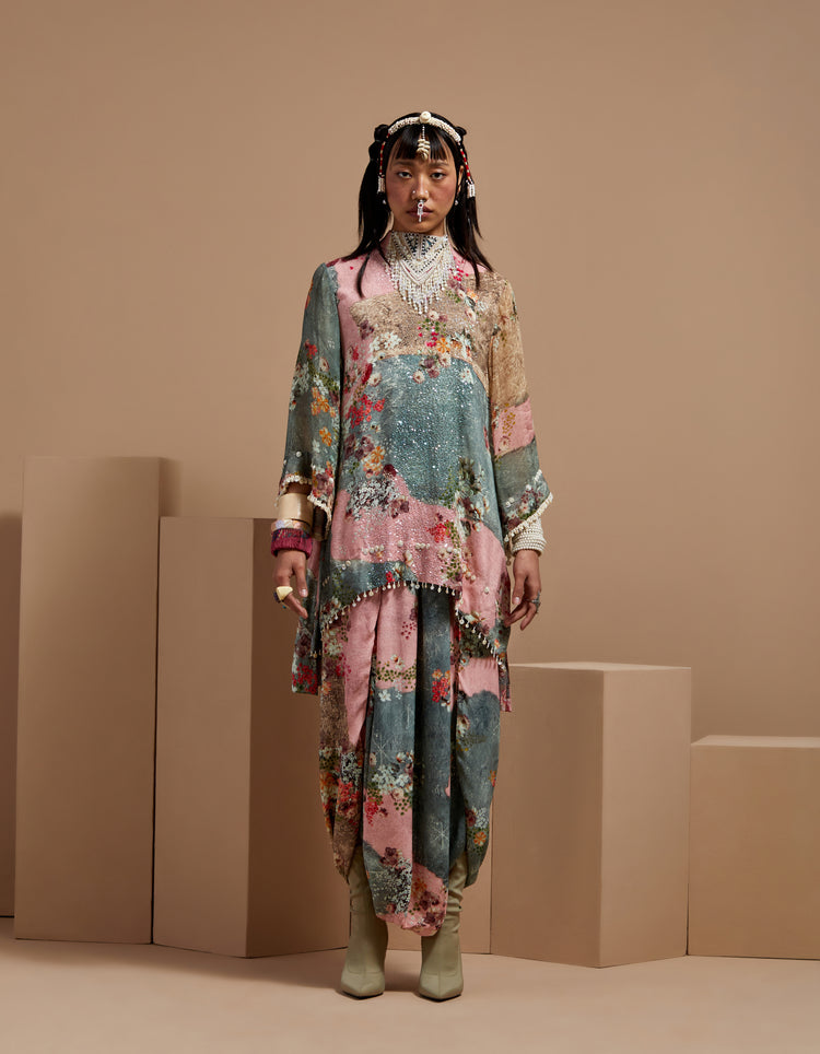 Printed kurta with embroidered hanging yoke paired with printed draped trousers. Resham thread embroidery, lace, M.O.P. beads, and tassel details. Relaxed-fit kurta with elasticated waist trousers.