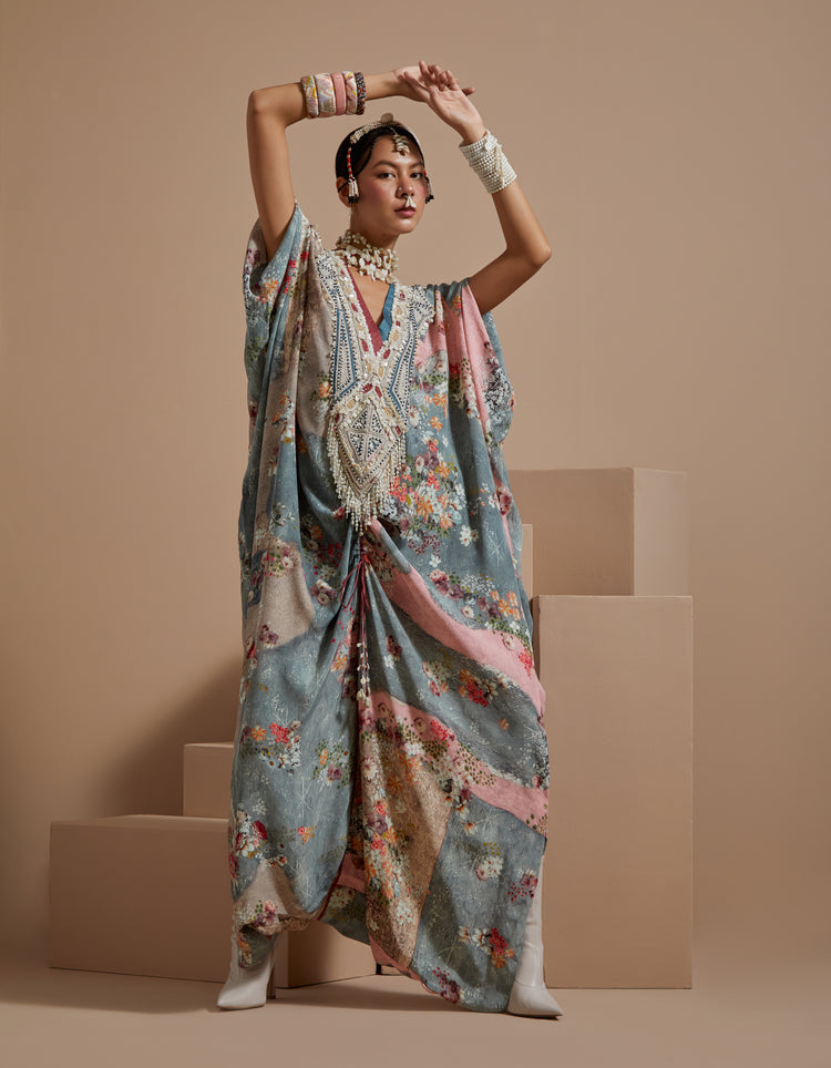 Printed kaftan jumpsuit with embroidered yoke, tassel accents, and metal zipper at the back. Features Resham thread embroidery, beadwork, and tassel details. Free-size silhouette with no armholes and adjustable drawstring.
