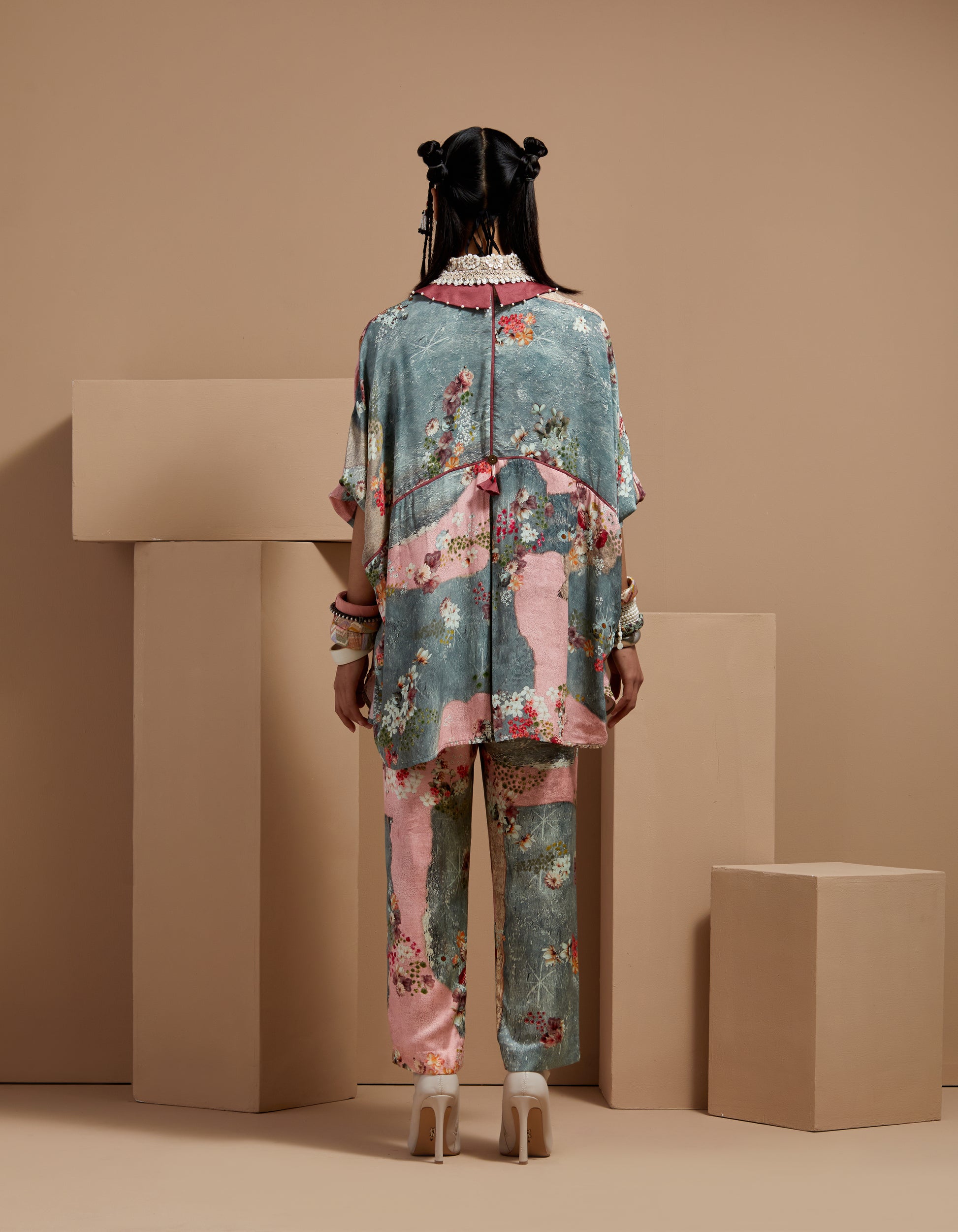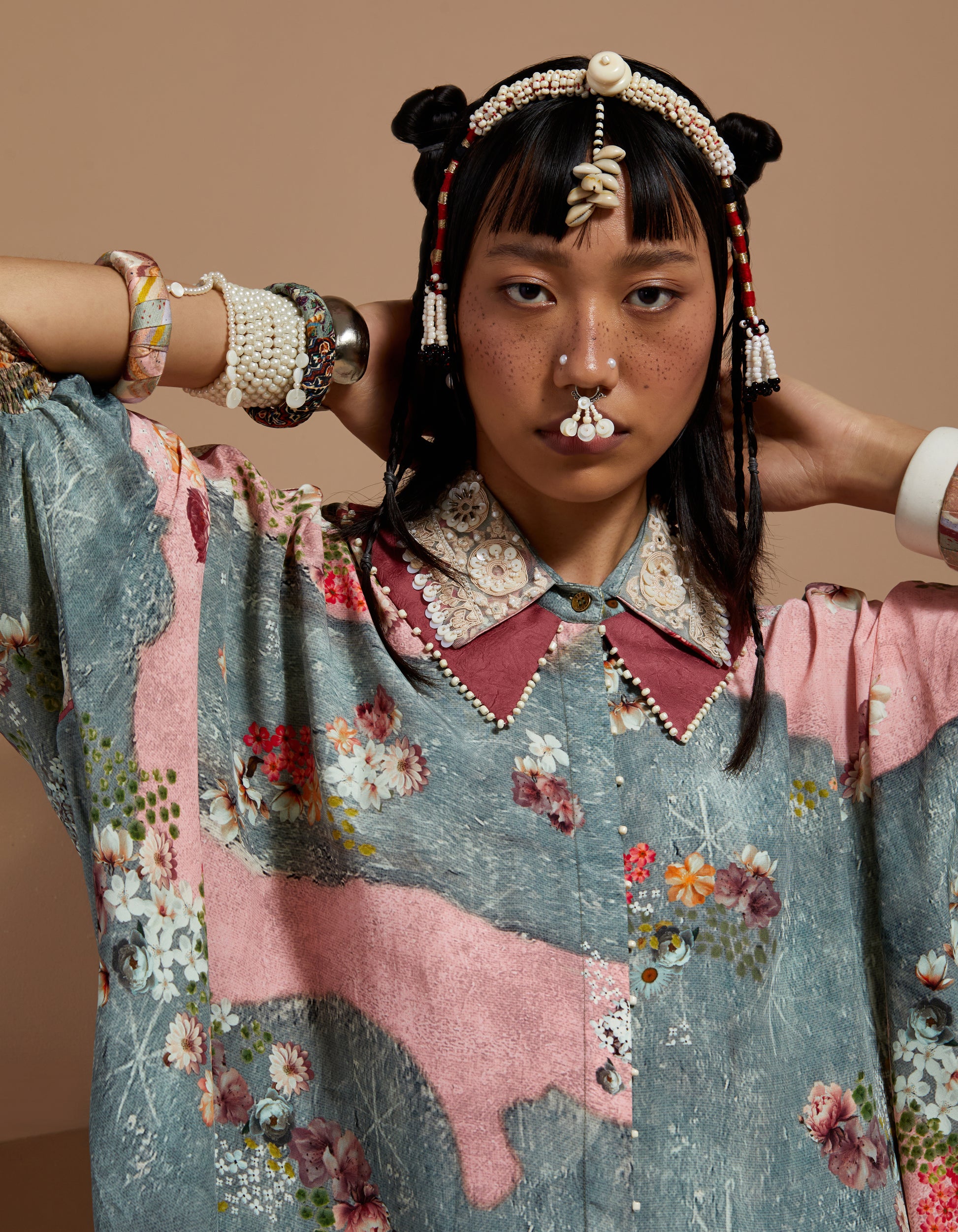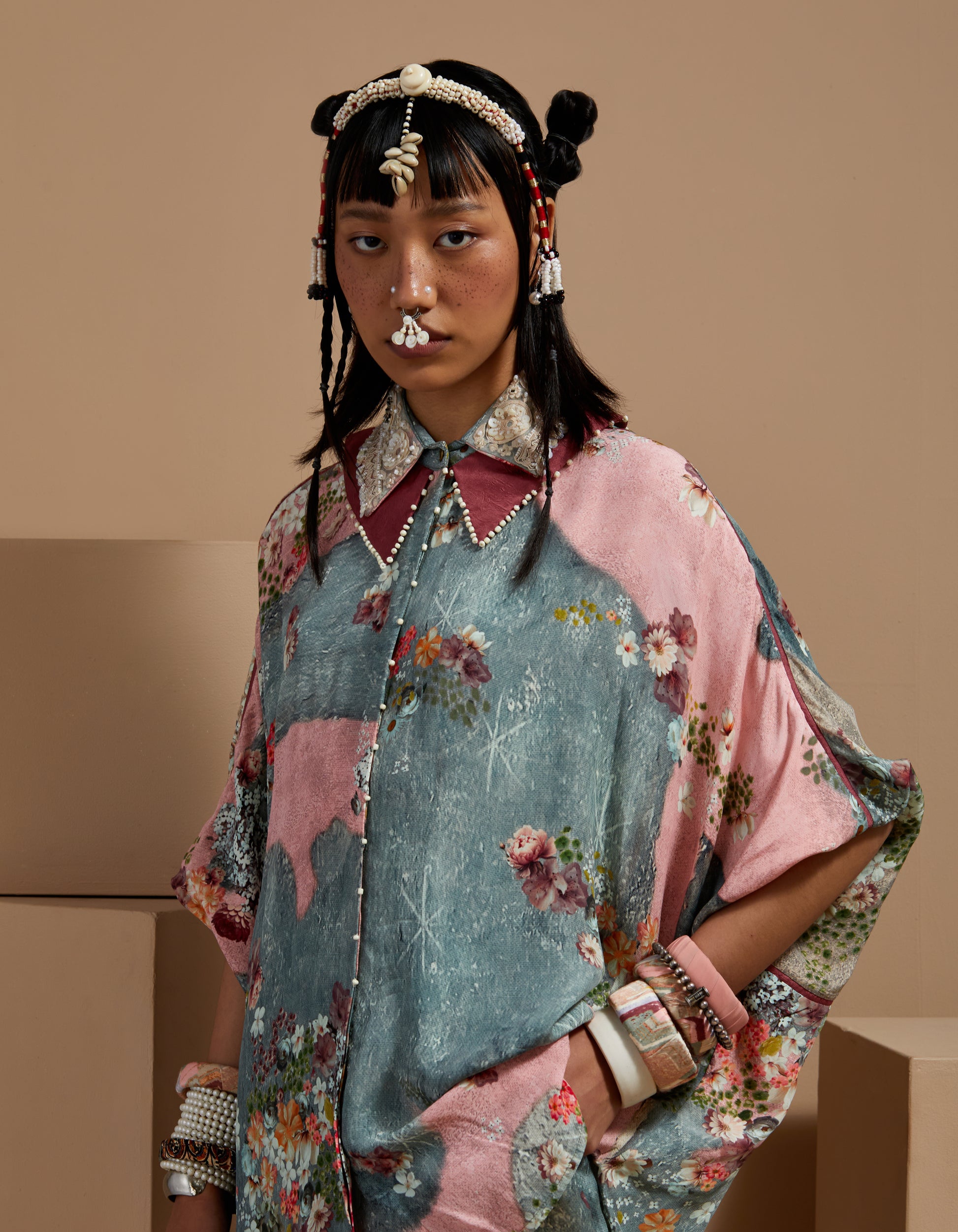 Trapeze printed shirt with inserts and embroidered collar. No armhole, easy fit for all sizes.