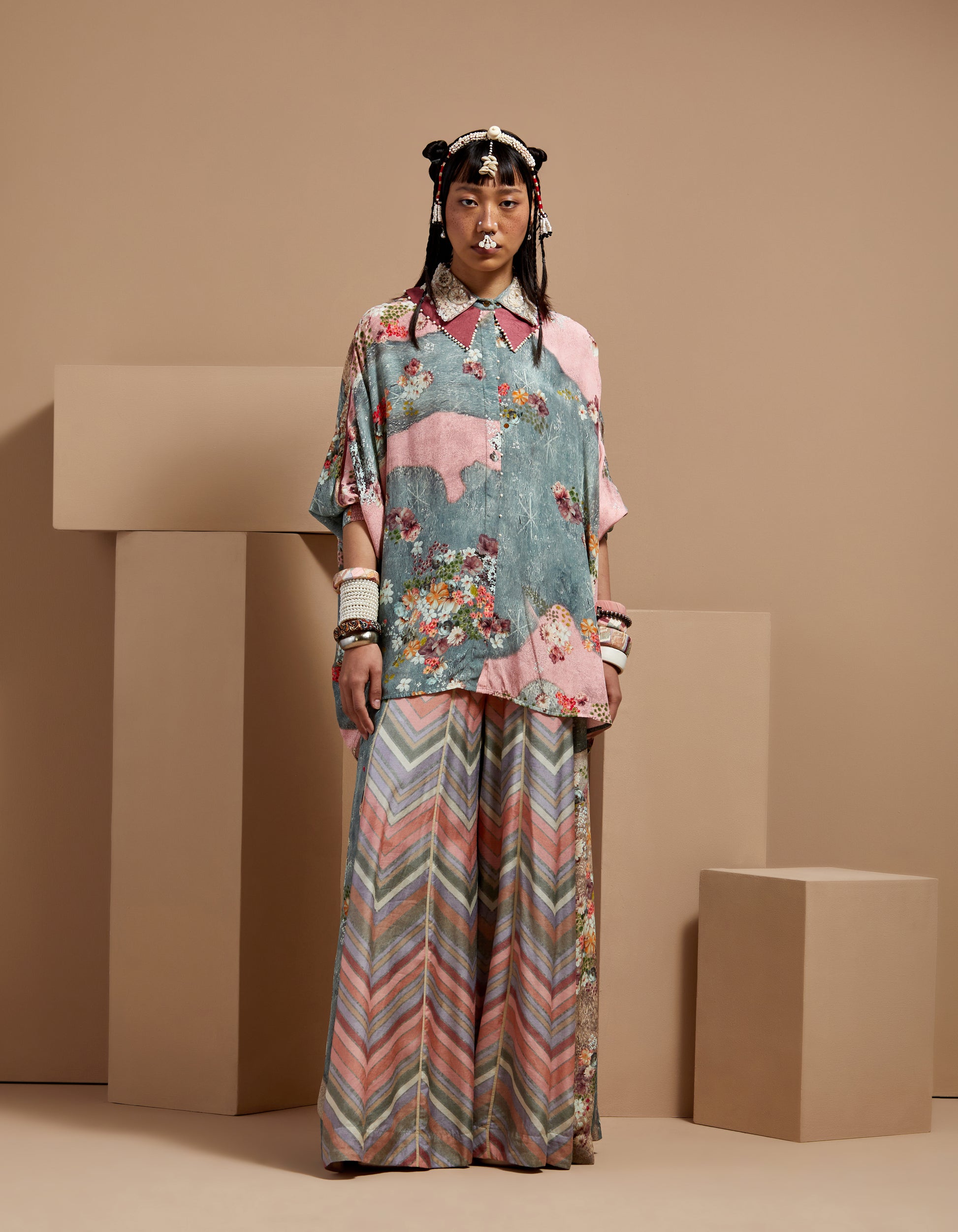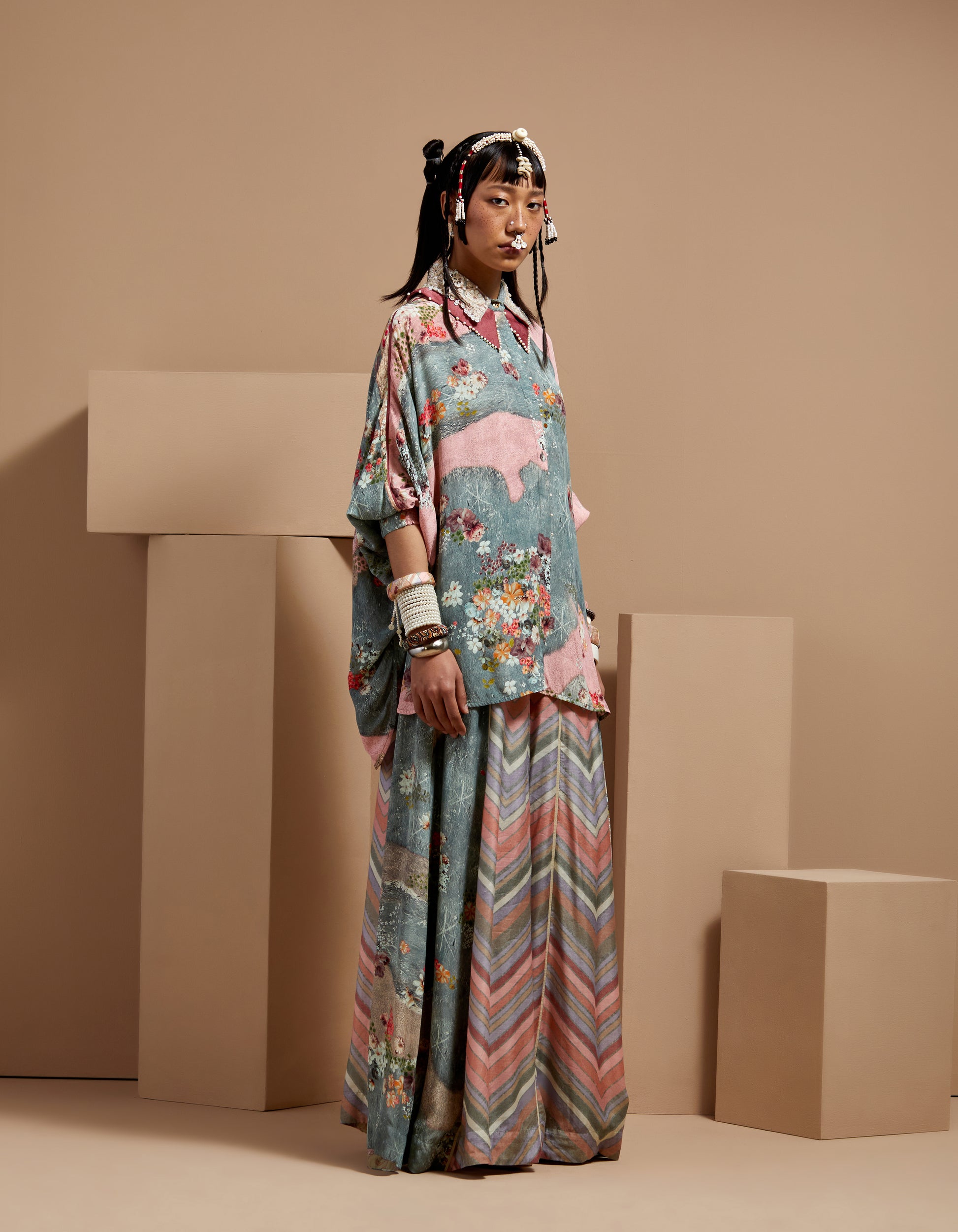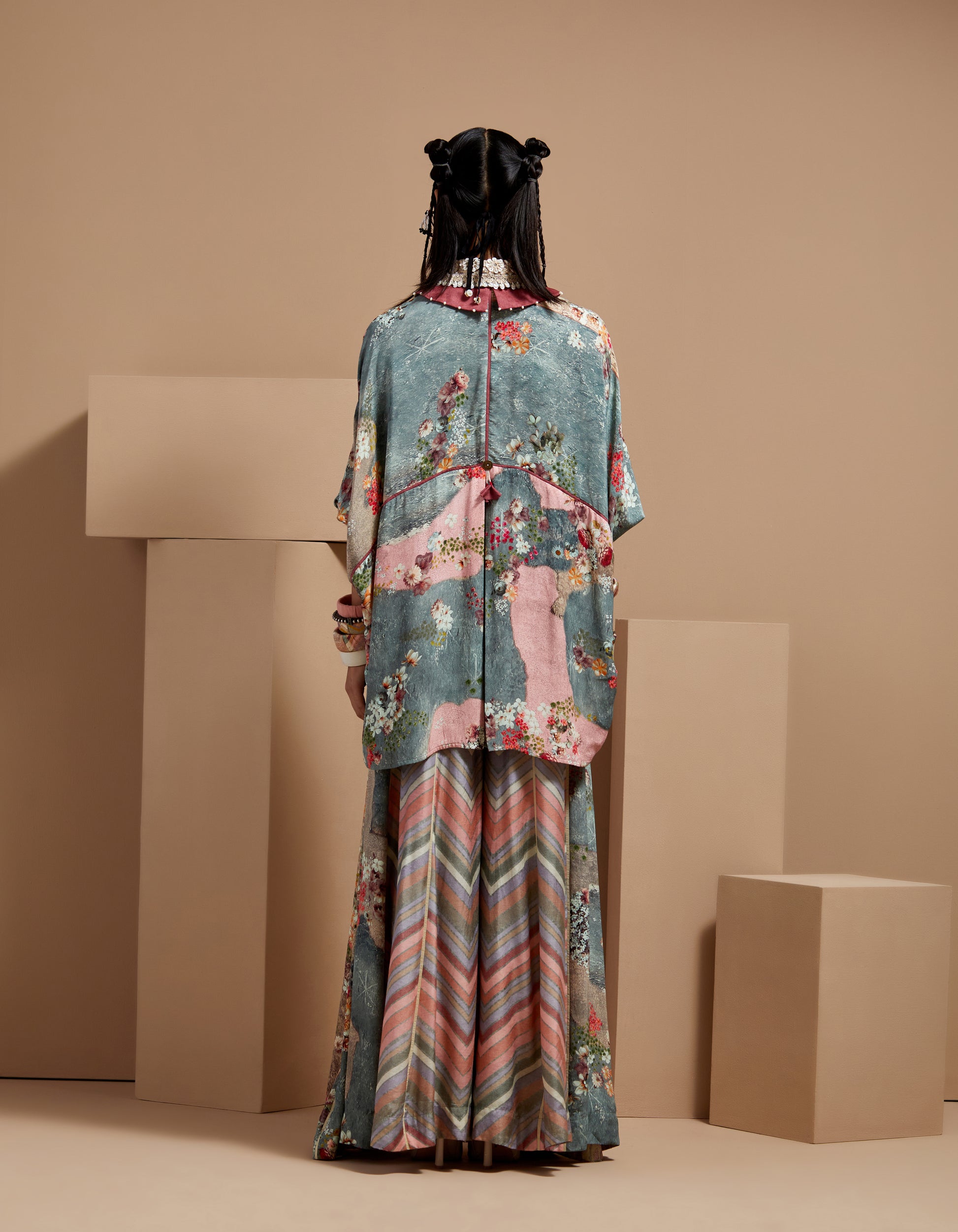 Trapeze printed shirt with inserts and embroidered collar, paired with printed sharara. No armhole, easy fit for all sizes with elasticated waist trousers.