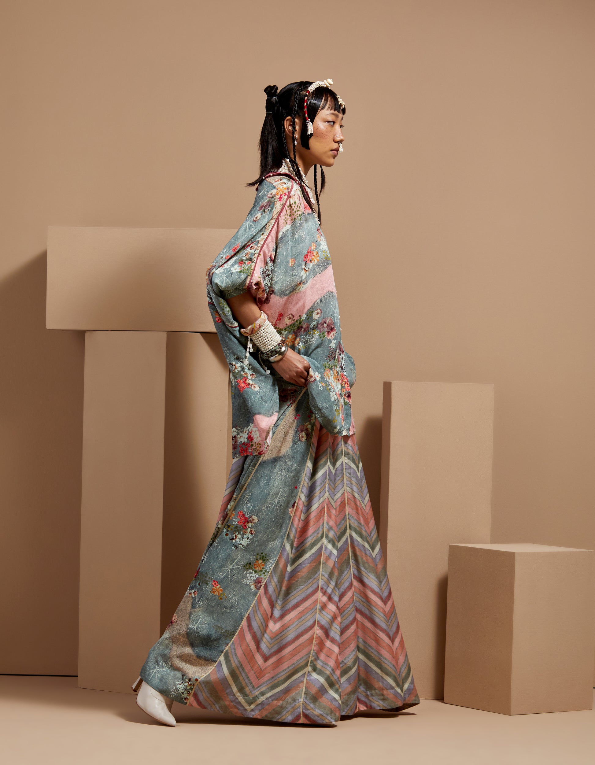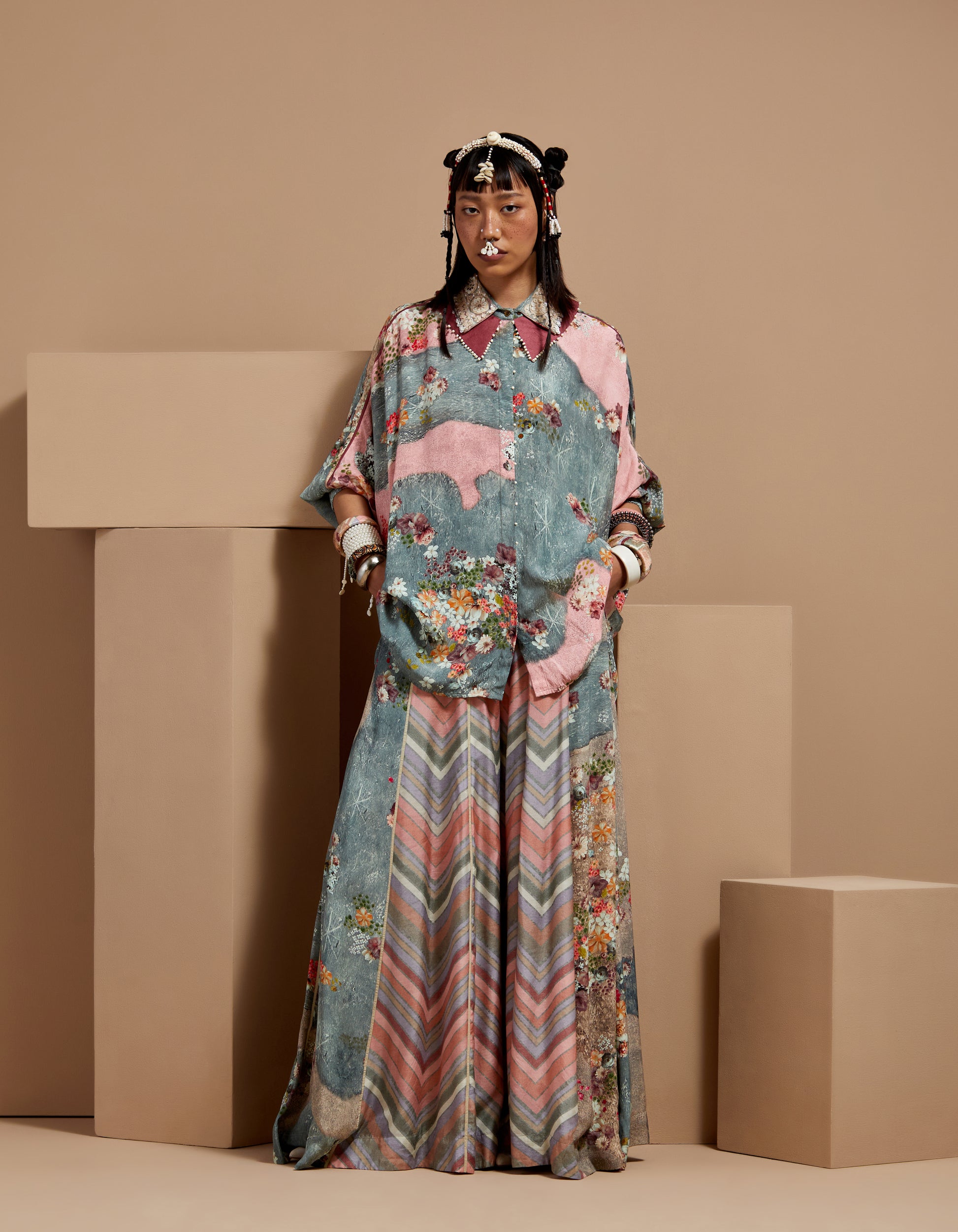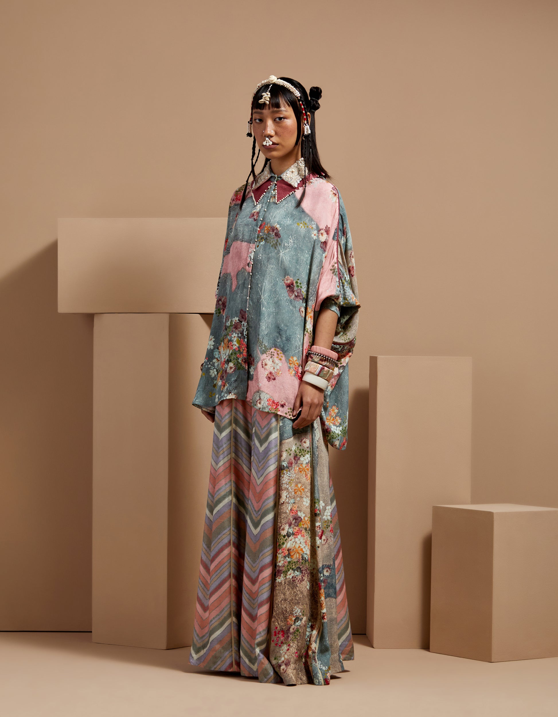 Trapeze printed shirt with inserts and embroidered collar, paired with printed sharara. No armhole, easy fit for all sizes with elasticated waist trousers.