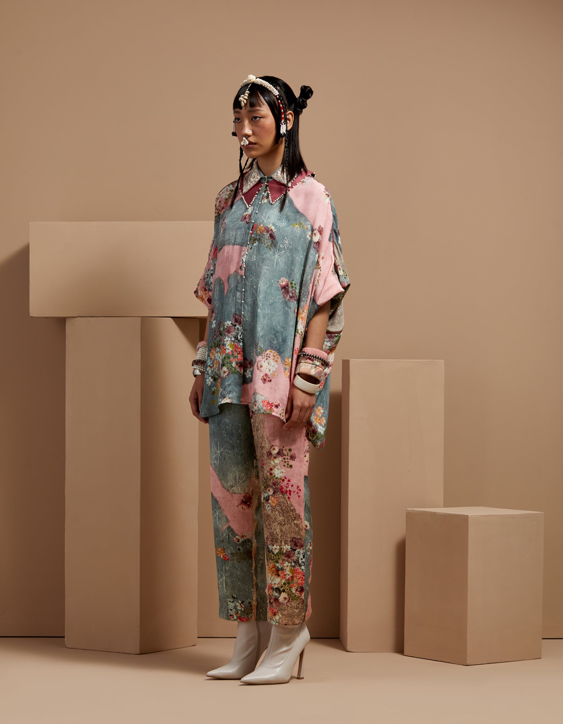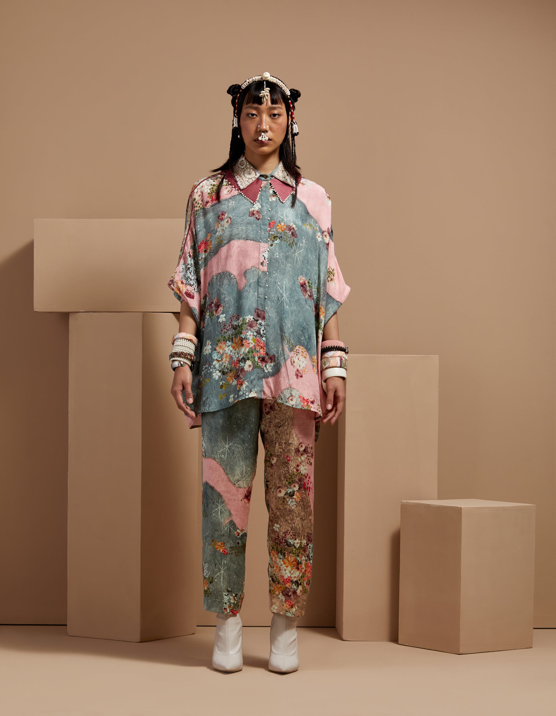 Trapeze printed shirt with inserts and embroidered collar, paired with printed slim-fit trousers. No armhole. Easy fit for all sizes with elasticated waist trousers.