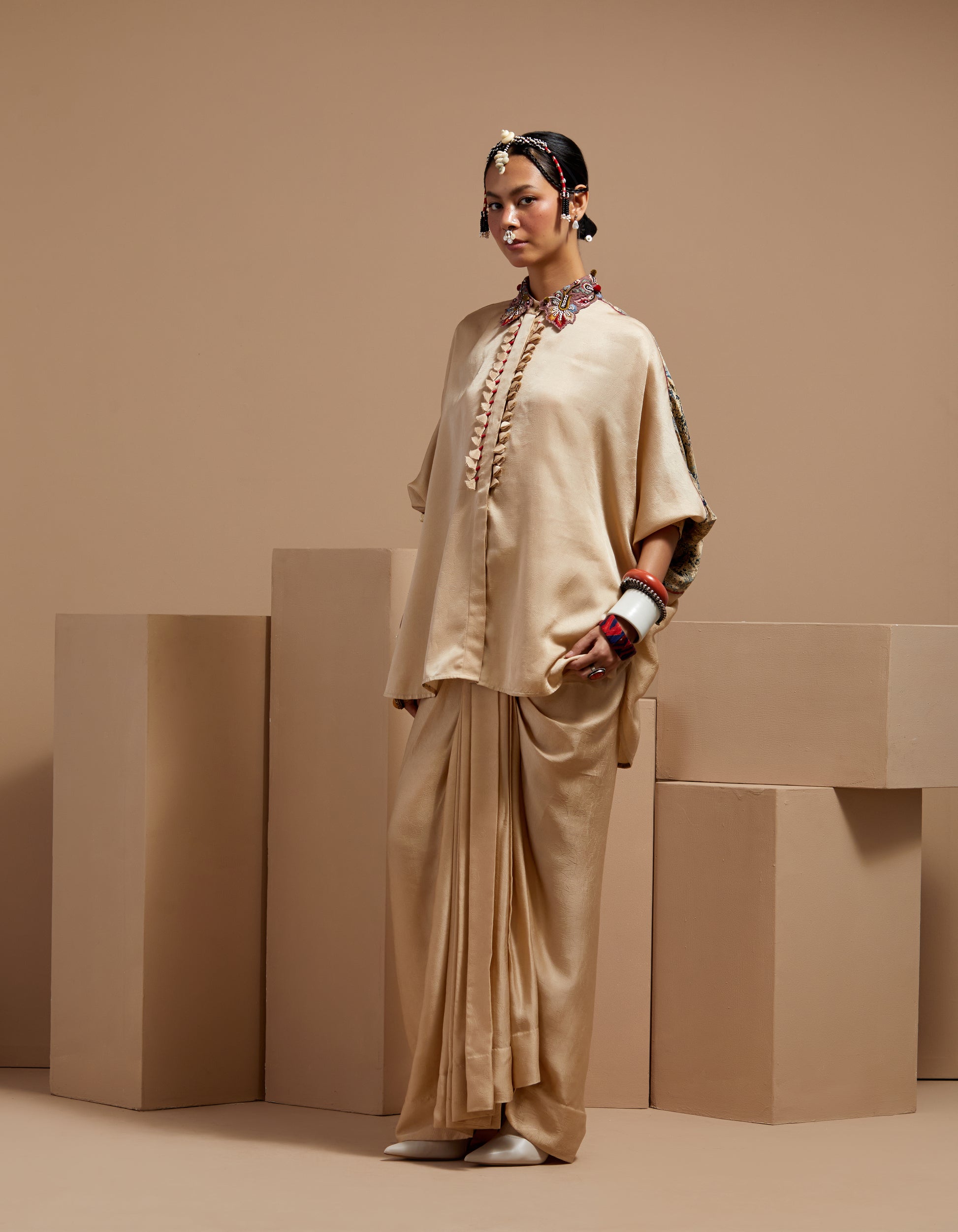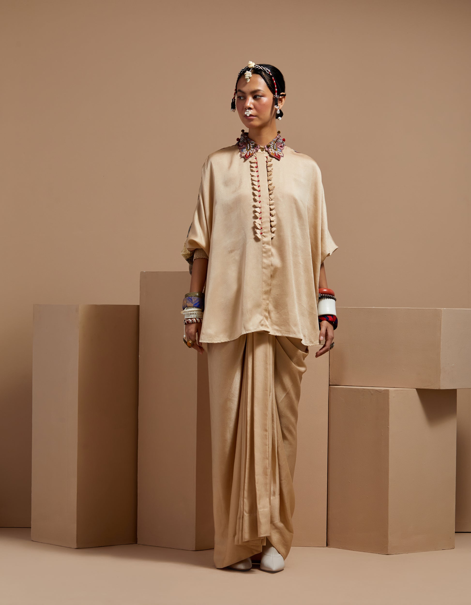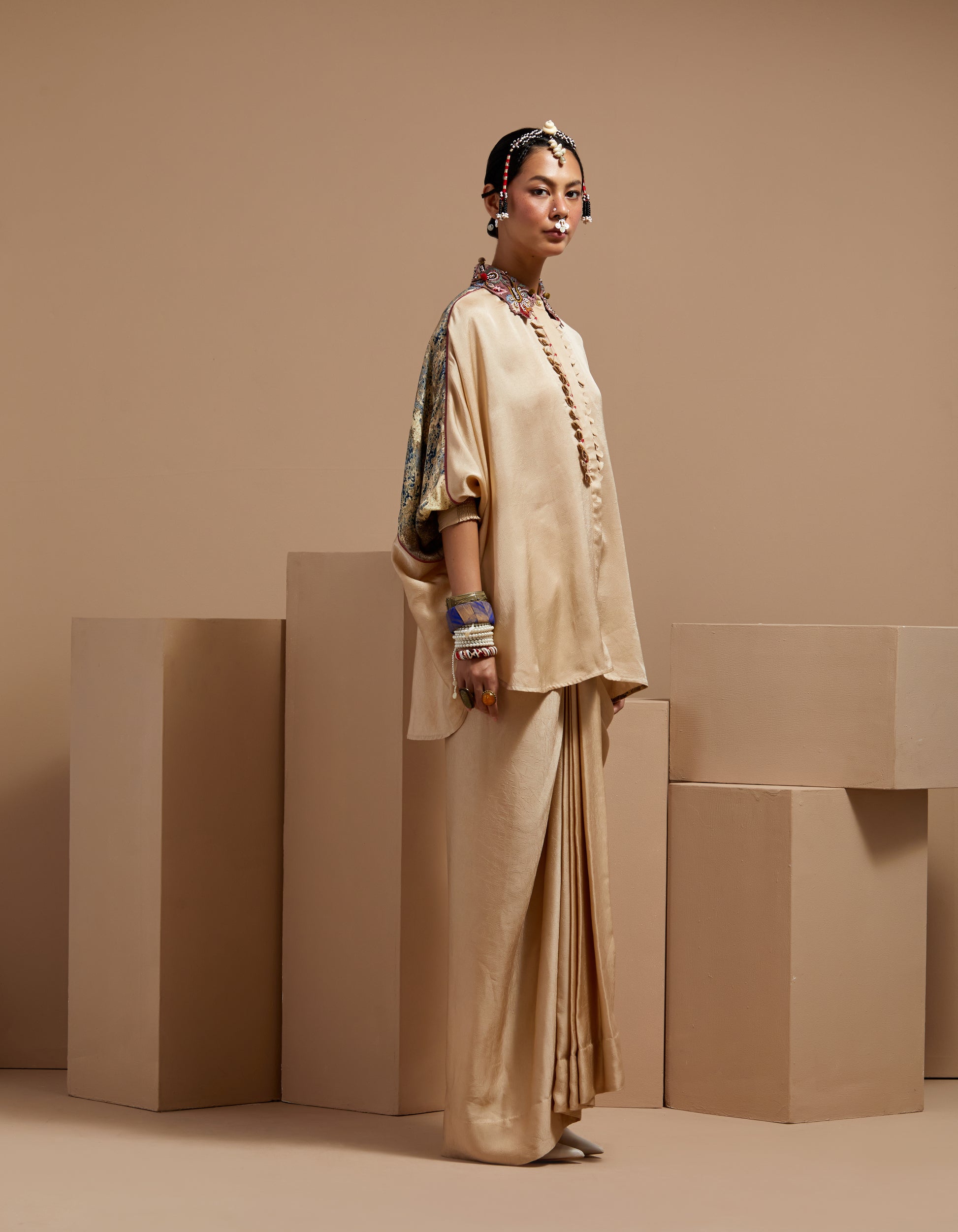 Textured solid straight shirt with tasseled work and raglan sleeves, paired with printed draped trousers. Fabric tassels on the placket. No armhole. Easy fit for all sizes with elasticated waist trouser.