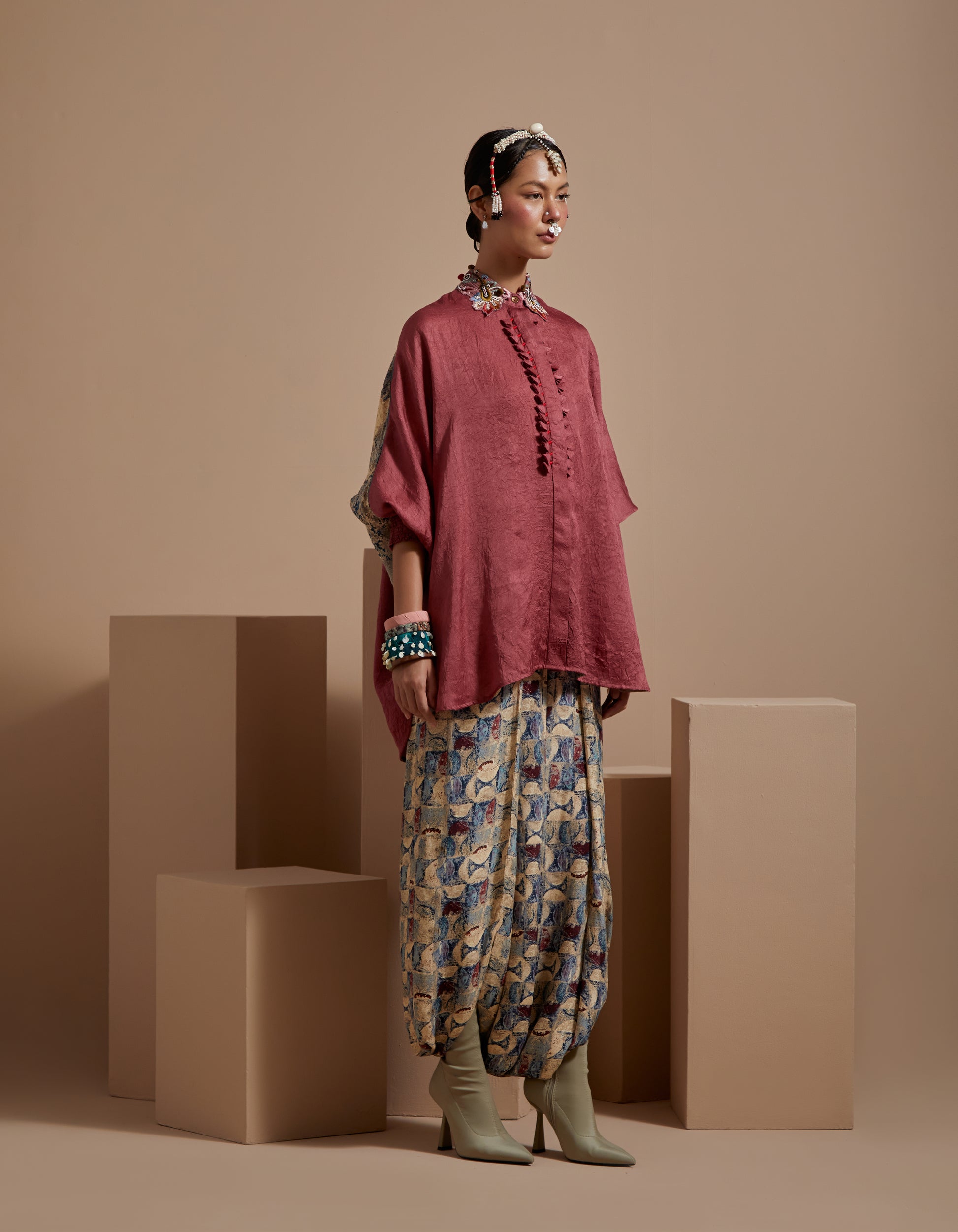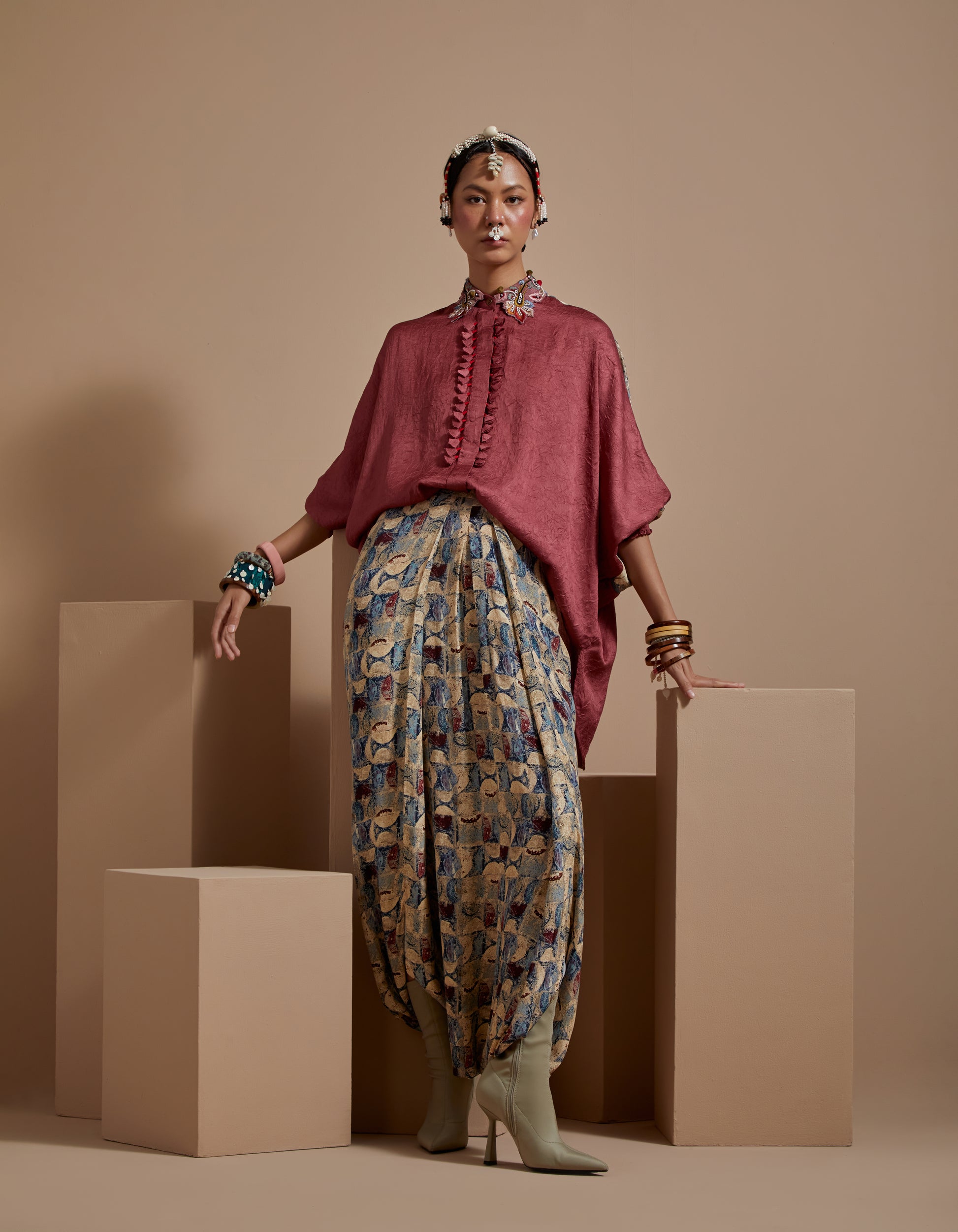 Textured solid straight shirt featuring raglan sleeves and fabric tassel detailing along the placket. Easy fit silhouette.