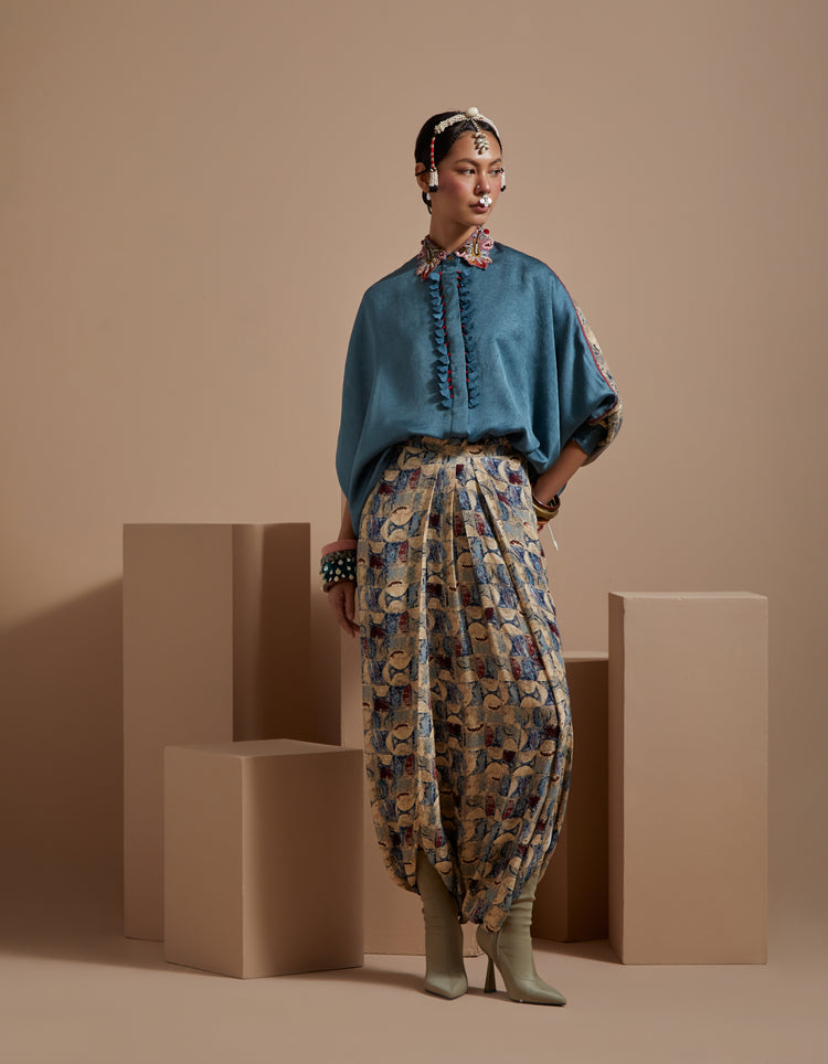 Textured solid straight shirt with raglan sleeves and fabric tassel detailing on the placket, paired with printed draped trousers. No armhole construction. Easy fit for all sizes with an elasticated waistband.